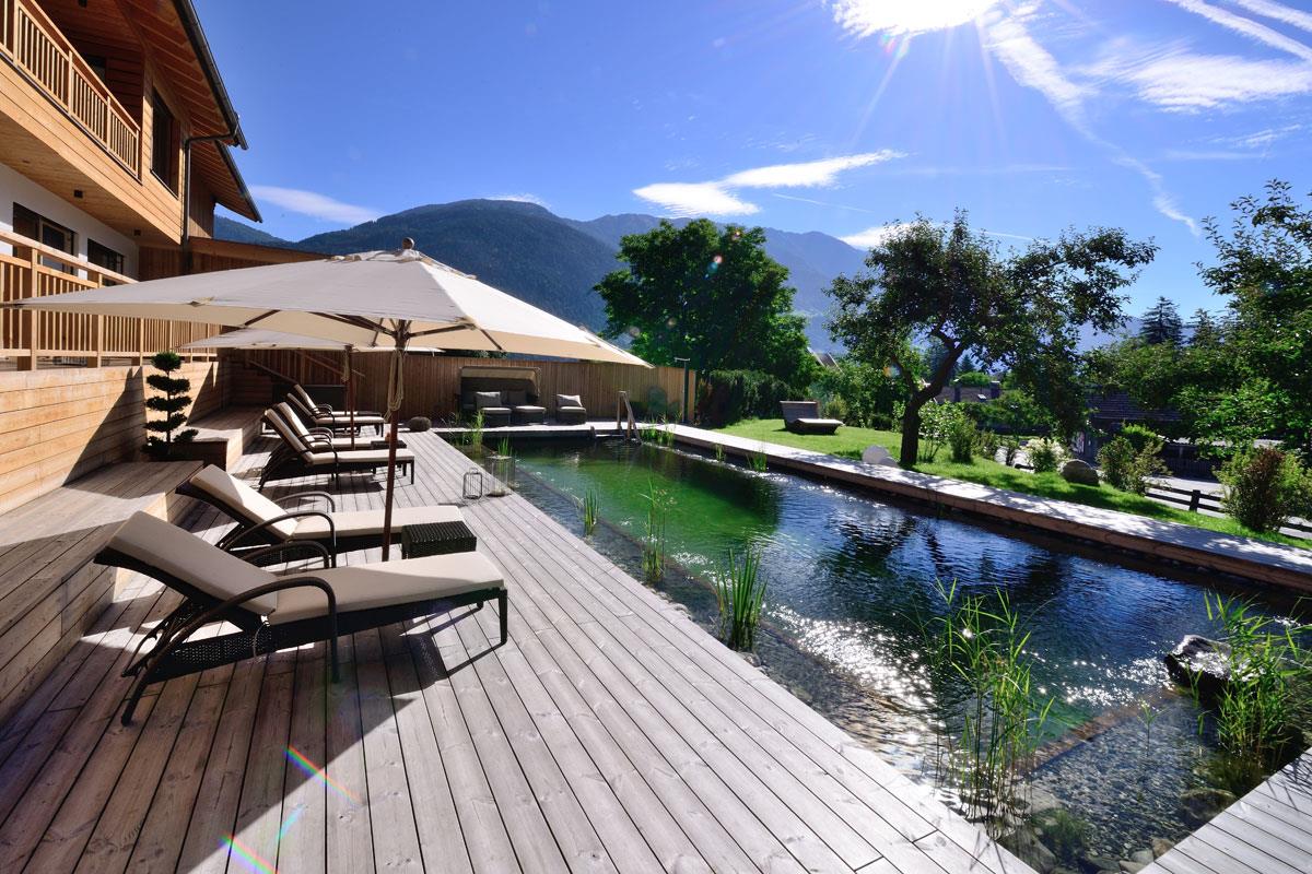 Das Leben genießen… Relaxen am Naturbadeteich, am Abend auf der Terrasse die Osttiroler Bergwelt bewundern und in den hochwertigen Apartments die Seele baumeln lassen. Bei einer Auszeit lässt sich das Leben in vollen Zügen genießen! In den drei hochwertigen, stilvollen Apartments mit vielen Naturmaterialien und Terrasse/Balkon mit Blick zum Pool können Sie es sich gut gehen lassen! In die Sonnenstadt Lienz und zum Dolomitengolfplatz Lavant sind es nur wenige Minu