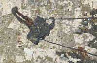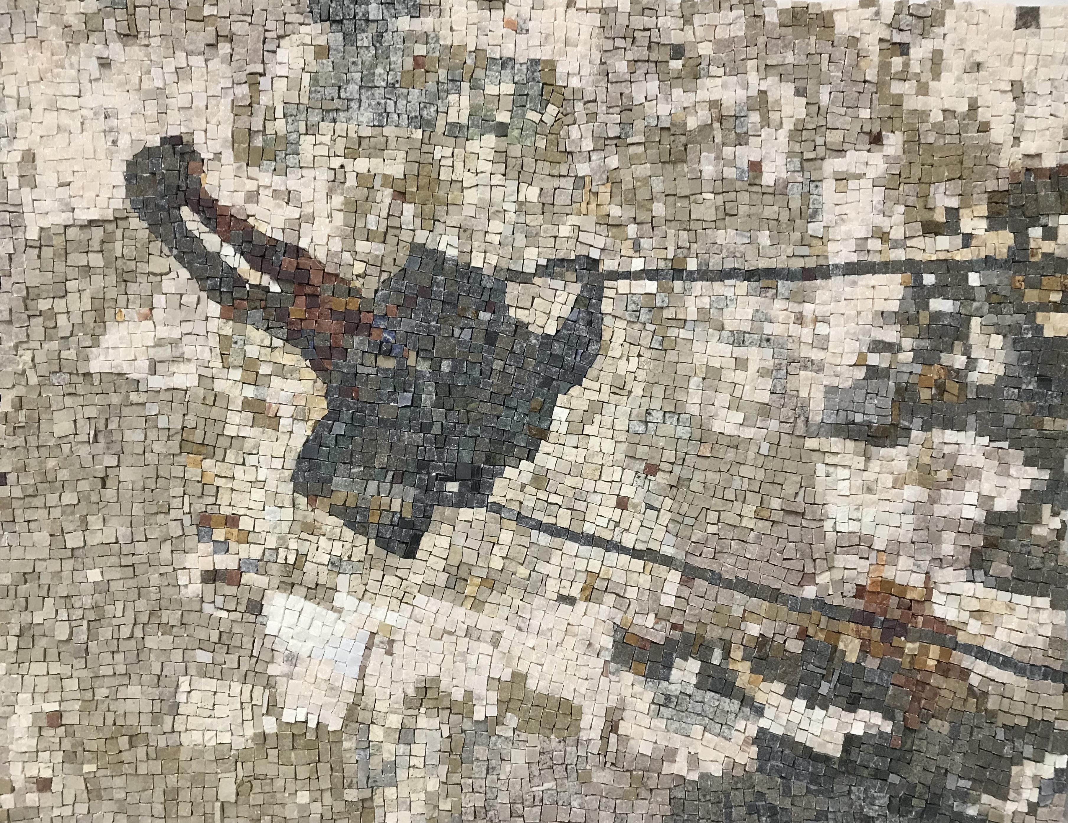 The motifs of the works are based on childhood memories. In the cycle "The Other Courtyard," Niedertscheider captures shadow images of children swinging – a swaying in airy heights in fascinating contrast to the grounded nature of the material. Just like memories in time, stepping back also creates different spatial perspectives than the immediacy of direct experience. The natural stones yield a muted, earthy color palette. Niedertscheider processes remnants from stone masonry, which he manually breaks down into cube-shaped stones, sorts, and prepares. The different fracture surfaces create a relief-like texture, and the incoming light produces corresponding effects. Contours and surface effects are exclusively achieved through the colors of the stones. The direct technique of mosaics allows for no subsequent corrections – what lies, remains.