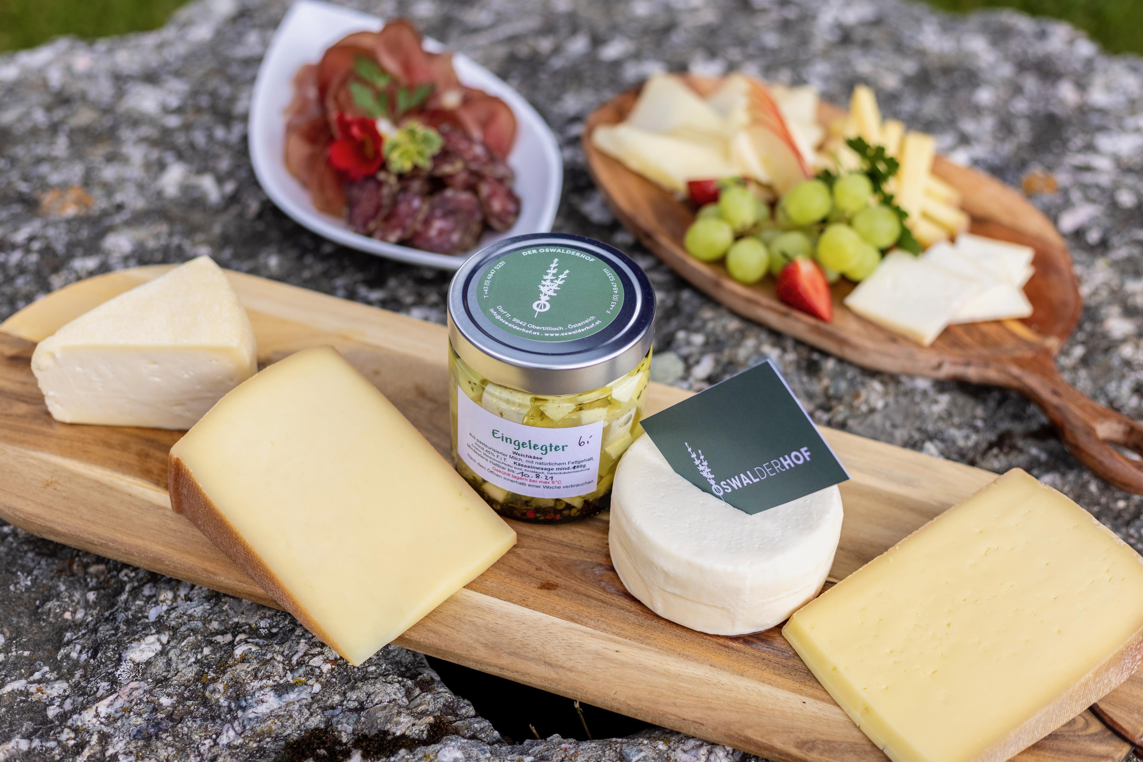 We produce four types of cheese for you in our own cheese dairy: Oswalder Berggenuss, Jungspunt, Salatkönig e Eingelegter