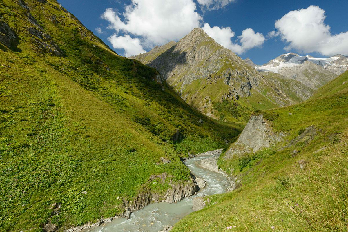 At first, the Iseltrail runs across wide alpine grasslands full of flowers. A steep scarp, which was covered by the glacier just a few decades ago, marks the beginning of the arctic climate zone of Hohe Tauern National Park. The source of the Isel is finally reached at the ice front of the Umbalkees below the mighty Dreiherrenspitze (3499m) – the highlight of the hike. Here the Isel leaves the huge ice stream in a constantly changing glacier mouth and via Drava and Danube heads towards the Black Sea.