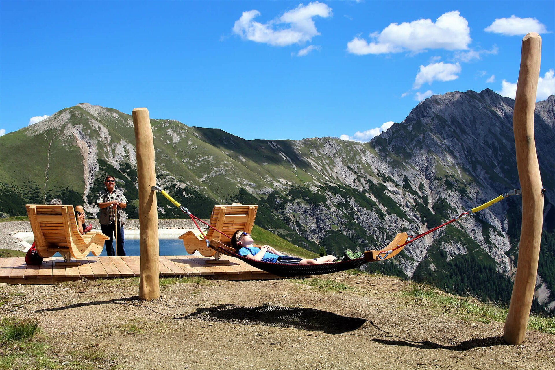 Eine Kugelbahn, ein Murmelbau, ein Wasserlauf, ein Geschicklichkeitstest beim Klettern auf Holzstämmen und ein Labyrinth und vieles mehr: Ja, für Abwechslung ist hier ausreichend gesorgt! Das Highlight für die ganze Familie stellt der aussichtsreiche Platz beim Speichersee dar. Hier schweift der Blick von den Hohen Tauern mit dem Großglockner im Norden über die Lienzer Dolomiten und Gailtaler Alpen weiter zum Karnischen Kamm, der die Grenze zu Italien bildet, eigene Relaxzonen laden zum Entspannen und Verweilen ein. Bei den Grillstationen ist alles für eine gemütliche Grillpause eingerichtet, nur die Würste müsst ihr selbst mitbringen. Gestärkt geht es dann die letzten Meter hinauf zum Gipfelbuch am Golzentipp, wo man sich auf jeden Fall noch eintragen sollte. Nur noch 20 Gehminuten vom Jochsee entfernt liegt der Gipfel, von dem du eine herrliche Aus- und Rundumsicht hast.