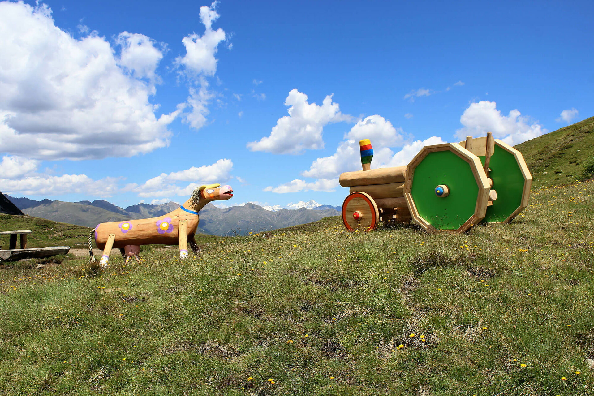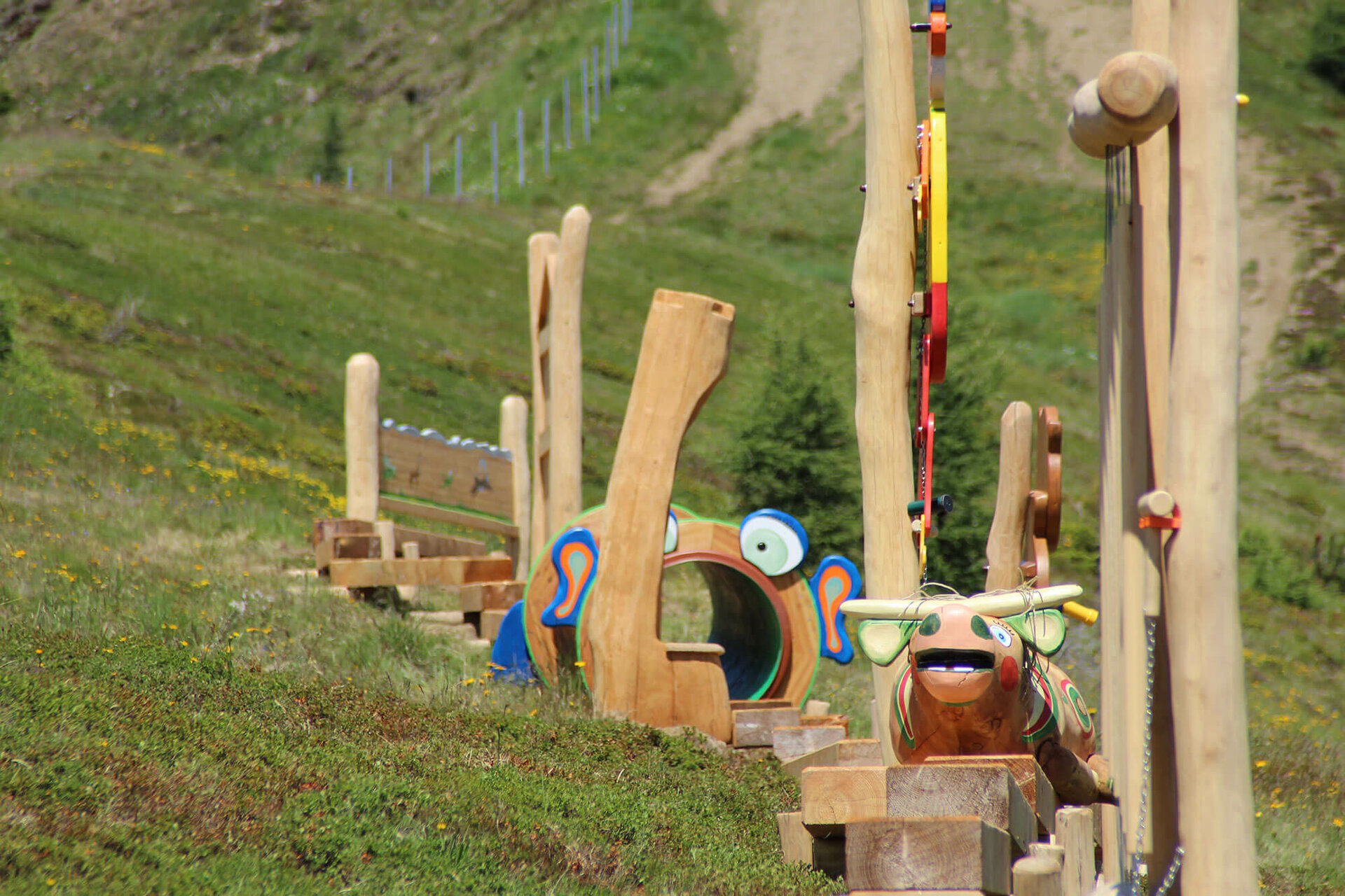 Insgesamt 13 Stationen locken Familien zur kinderwagentauglichen Runde auf der Kindermeile im Wandergebiet Golzentipp. Ausgangspunkt ist die Bergstation der Gondelbahn.