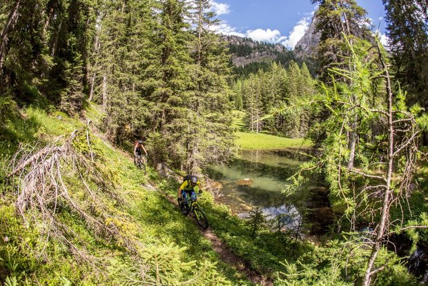 Auch dieser Tag beginnt mit einer Abfahrt: Von der Hochsteinhütte rollt man wieder ins Tal hinunter und trifft bei Leisach wieder auf die Drau. Jetzt zieht sich die Route eine Weile durchs Tal, vorbei an den Bauernhöfen in Ulrichsbichl. Wenig später zweigt rechts eine Asphaltstraße ab, die sich stetig steigend zum Tristacher See hinauf zieht. Zeit für ein Bad? Nach weiteren 800 Höhenmetern erreicht man einen Parkplatz. Nur noch wenige Meter, dann rückt die malerisch gelegene Dolomitenhütte ins Blickfeld. Übernachtung: Die Lienzer Dolomitenhütte liegt spektakulär auf einem Felsvorsprung mit Blick in die massive Wand des Spitzkofelmassivs.
