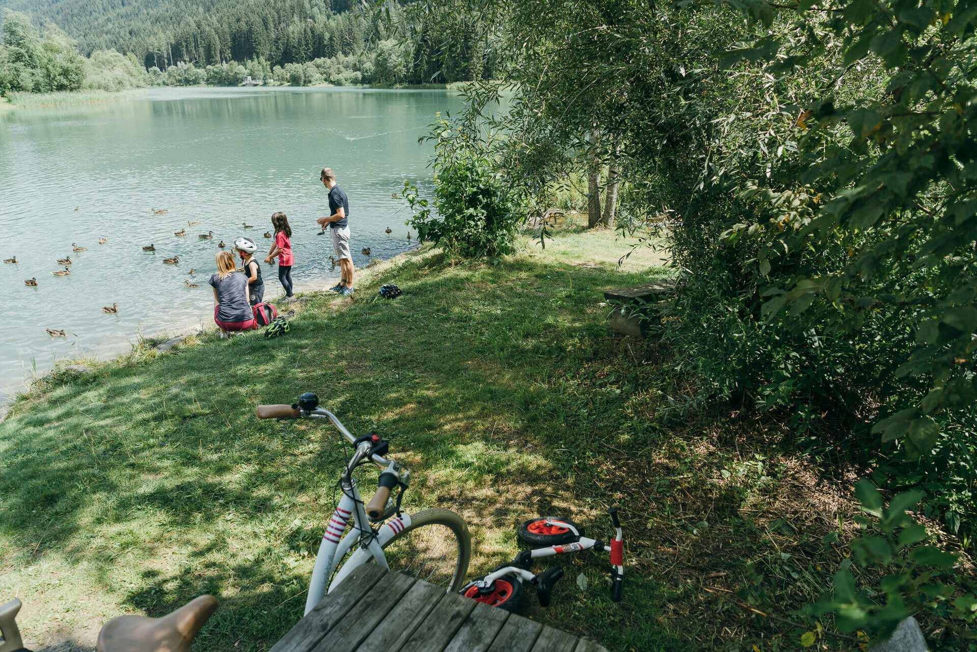 Eine Familie spielt am Ufer der Isel, im Vordergrund stehen zwei Räder eines in weiß und ein Kinderrad in giftgrün