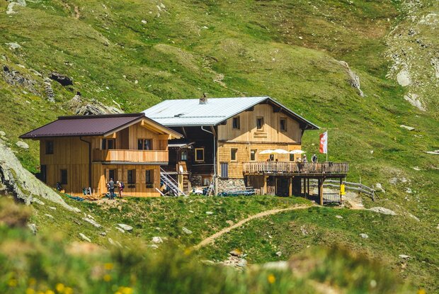 Von der Johannishütte geht es Richtung Kreuzspitz-Höhenweg, anfangs durch satte grüne Matten, später durch felsiges Gelände. In diesem Bereich könnte man auch einen Abstecher auf die „Kreuzspitze“, mit ihrem atemberaubenden Blick auf den Großvenediger wagen. Die super Linienführung und die tollen Ausblicke auf die benachbarten Gletscherberge belohnen für den langen Zustieg. Der Adlerweg führt jedoch weiter zur Sajathütte, dem „Schloss in den Bergen“. Das Etappenziel – die einfachere, aber ebenfalls gemütliche Eisseehütte – liegt allerdings noch ein gutes Stück entfernt.