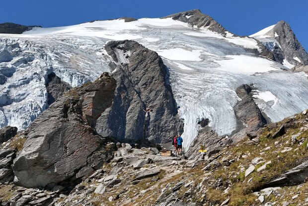 Von der Badener Hütte (2.608 Meter) wandert man zuerst über den Venediger Höhenweg bzw. Adlerweg (hier auch Badener Weg) nordwärts ca. eine Stunde hinauf zum Löbbentörl (2.770 Meter). Dabei sind einige felsdurchzogene Rinnen und kleine Schluchten seilversichert. Über eine kurze Halde steigt man weiter zum Löbbentörl hinan, wo im Schutz eines Felsens ein Kreuz und eine Gedenktafel stehen. Von nun an geht es steil bergab. Der nordseitige Abstieg mit kurzen Seilstellen führt auf Fels-Rasen-Rücken und Altschnee hinunter zur Seitenmoräne des Schlatenkees´. Auf dieser Moräne steigt man weiter ab. Am Unteren Keesboden gibt es einen Übergang zur Alten Prager Hütte (nicht bewirtschaftet), hier kann man auch zum faszinierenden Gletscherschaupfad „Innergschlöss“ abzweigen. Der Venediger Höhenweg passiert den Salzbodensee (2.731 Meter), in dem sich Hoher Zaun und Schwarze Wand spiegeln. Nördlich des gletscherweißen Gschlössbaches wendetsich der Weg scharf nach Osten. Im gletschernahen, gut geführten Venedigerhaus (1.689 Meter) lässt sich eine gemütliche Rast einschieben. Entlang des Gschlössbaches geht es dann weiter talauswärts, zwischen den Almen von Inner- und Außergschlöss bietet sich ein Innehalten bei der alten Felsenkapelle an. Eine Einkehr weltlicher Art ist im Berghaus Außergschlöss (1.700 Meter) empfehlenswert. Das Tal weitet sich nun. Von Gschlöss geht es noch ca. eine Stunde sanft über nicht einmal 200 Höhenmeter bergab zum Matreier Tauernhaus (1.512 Meter), wo man nach den langen fordernden Abstiegen dieser Etappe vermutlich etwas knieweich ankommt. Hier kann man sich ausruhen, feine regionale Schmankerln genießen und komfortabel übernachten.