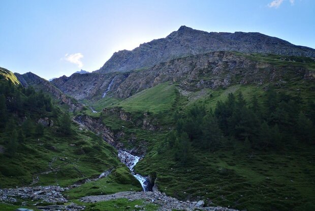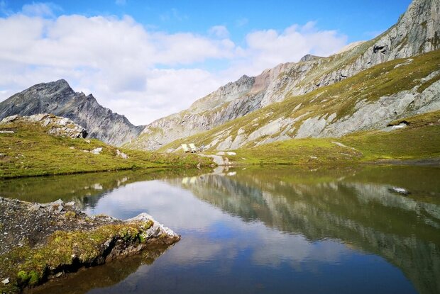 Am besten startet man diese Etappe beim Parkplatz im Weiler Glanz, dann spart man sich zwei Stunden Anmarsch. Von Matrei i.O. kann man mit dem PKW (Taxidienst auf Anfrage) in 20 Minuten dorthin gelangen. All jene, die auch diesen ersten Streckenabschnitt zu Fuß bewältigen wollen, gelangen über den wenig befahrenen Fahrweg von Matrei über Hinterburg zum Parkplatz. Vom Parkplatz in Glanz kommt man in 1 ½ bis 2 Stunden zur Äußeren Steiner Alm und in weiteren 2 bis 2 ½ Stunden zur Sudetendeutschen Hütte. Der Steig führt großteils durch einen Wald mit uralten Lärchen, vorbei an der Köfler-Almhütte (Privatalm). Im Bereich der Ranzeralm quert man zweimal den Fahrweg. Etwas oberhalb der Lackner-Almhütte beginnt ein Karrenweg, der an einer Quelle vorbeiführt, ehe er von Osten nach Westen die Edelweißwiese durchzieht. Wer nicht durch den Wald wandern möchte, kann auch vom Parkplatz Glanz entlang der Forststraße bis zum Beginn der Edelweißwiese gehen. Nach einer Felskante fällt der durch ein Geländer geschützte Steig in den lichten Lärchenwald leicht ab. Über den Steinerbach gelangt man zu den Almhütten der Äußeren Steiner Alm (1.914 Meter), von der Äußeren Steiner Alm geht es in der flachen Trogtalsohle nordöstlich weiter in Richtung Talschluss. Kleine Lärchenhaine und gewaltige Grünschieferblöcke prägen diesen romantischen Wegabschnitt. Am Ende des Talschlusses führt eine Materialseilbahn zur Sudetendeutschen Hütte, hier befand sich früher eine Förderstätte des Eisenerz-Bergbaus, deshalb wird der Talwinkel als „Schmelzhütte“ bezeichnet. Der Steig zur Sudetendeutschen Hütte führt zuerst nah am Steinerbach hinauf, dann windet er sich in Kehren über die Wiesenhänge empor, wobei man den Nussingkogel zur linken und die Bretterwandspitze zur rechten Seite hat. Schließlich wird das Gelände mit seinen von den Gletschern geformten Kuppen etwas flacher und schon befindet man sich im Nahbereich der geräumigen Sudetendeutschen Hütte (2.650 Meter) inmitten der Granatspitzgruppe.