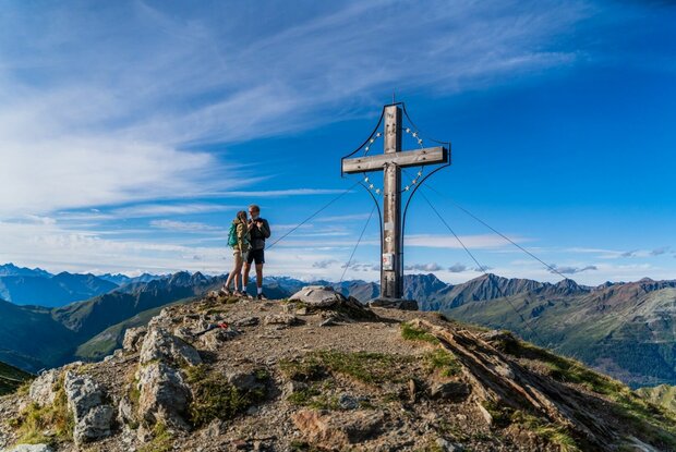 Für den weiteren Aufstieg nehmen wir den Steig Nr. 3, 14 Richtung Strickberg, der immer wieder eine alte parallel verlaufende Militärstraße schneidet. Ein herrlicher Aus- und Rundumblick belohnt die Mühen des Aufstiegs auf das Marchkinkele, mit 2.545 m der höchste Punkt dieser Etappe. Bis ins Tiroler Gailtal, zu den Dolomiten, zu Spitzkofel, Kronplatz und Zillertaler Alpen reicht an schönen Tagen die Fernsicht. Beim Abstieg folgen wir den Wegen Nr. 5 und 5A in Richtung Alfenalm und weiter zu unserem Etappenziel, die Kirche Maria Schnee in Kalkstein.