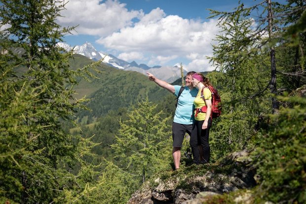 Die Wanderung startet bei der Bergstation der Kalser Bergbahn. Dort thront die Adlerlounge, am Grat zwischen Matrei in Osttirol und Kals am Großglockner. Auf der Aussichtsplattform Adlerhorst kannst du den Großglockner und weitere 60 Dreitausender in aller Pracht bestaunen.