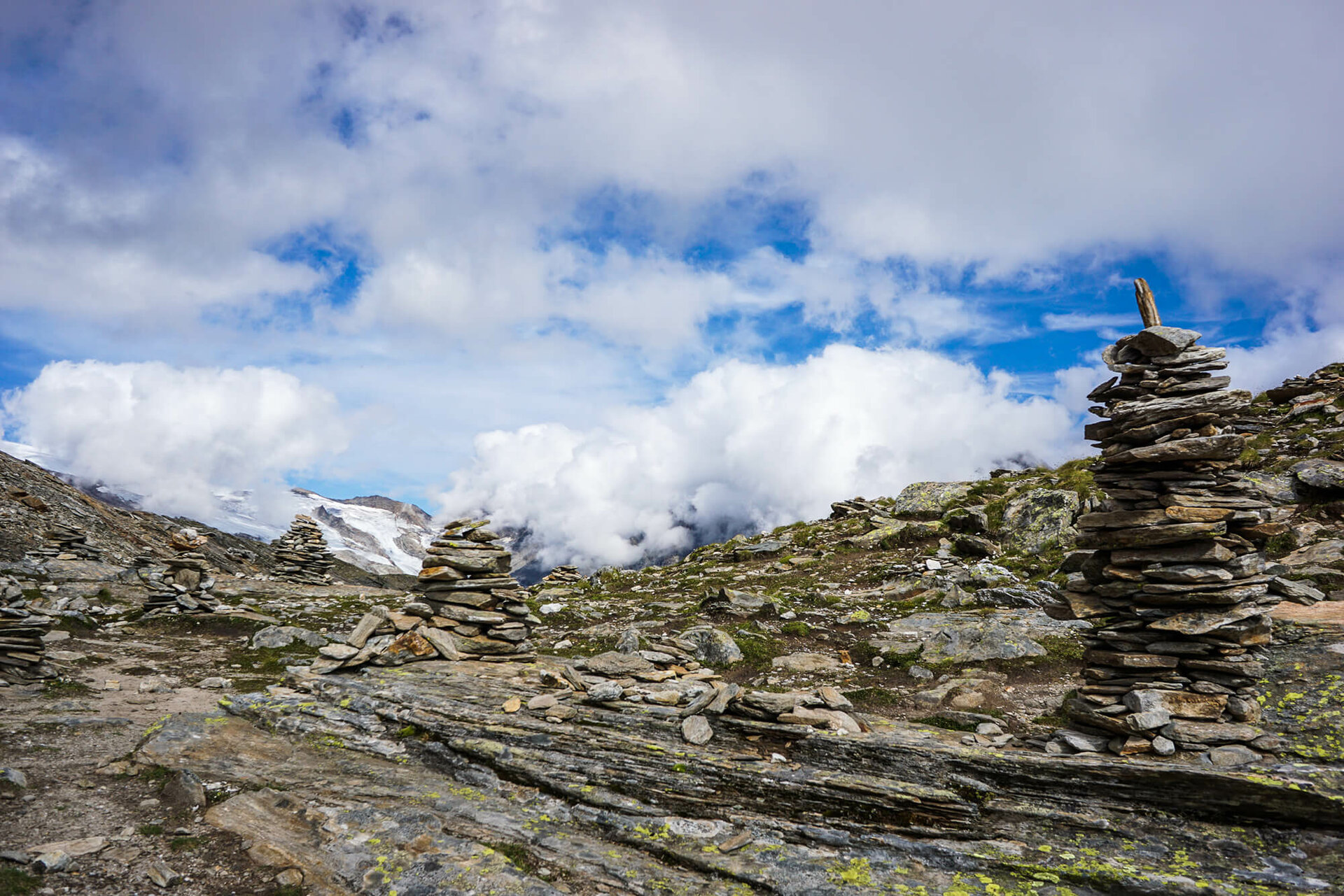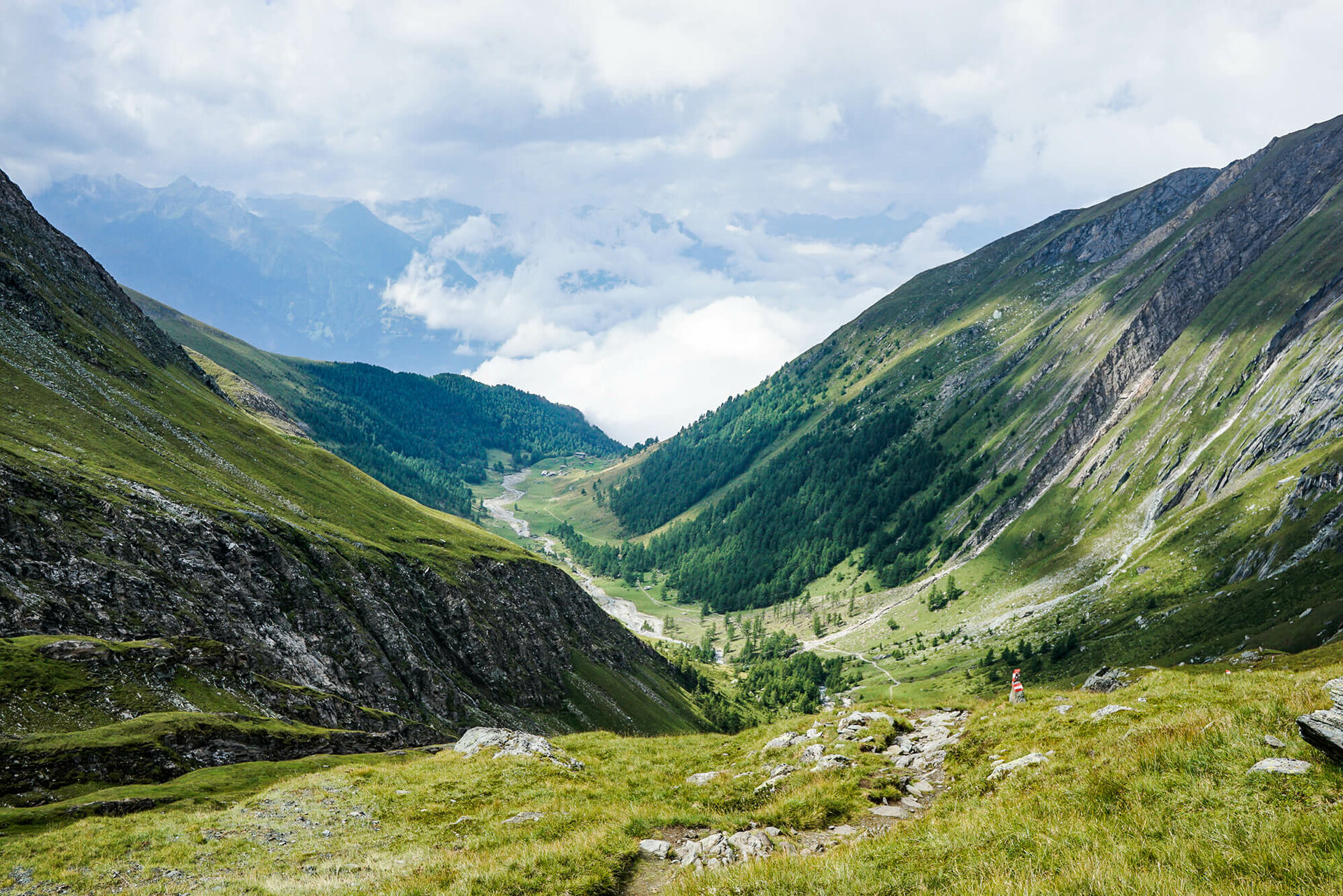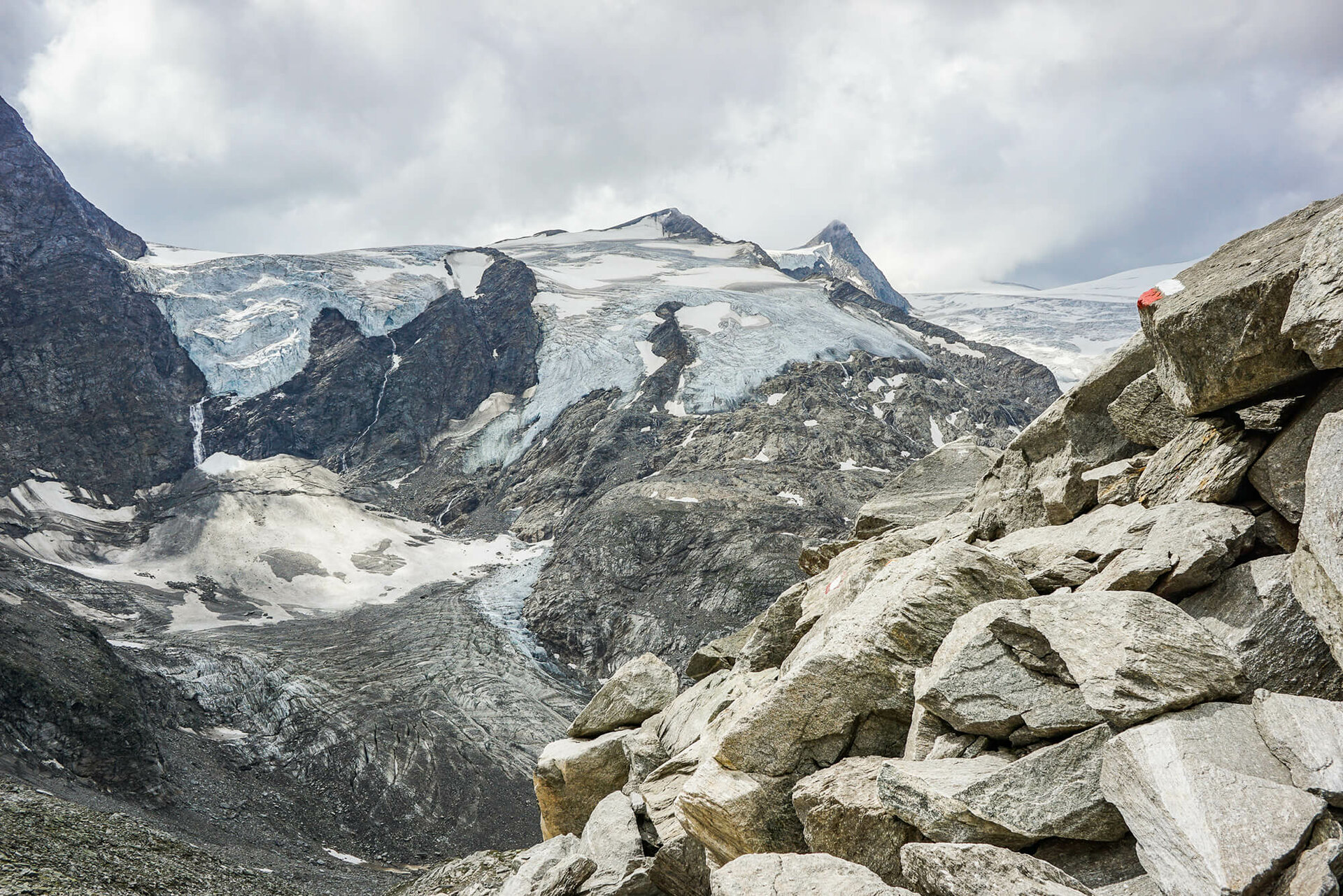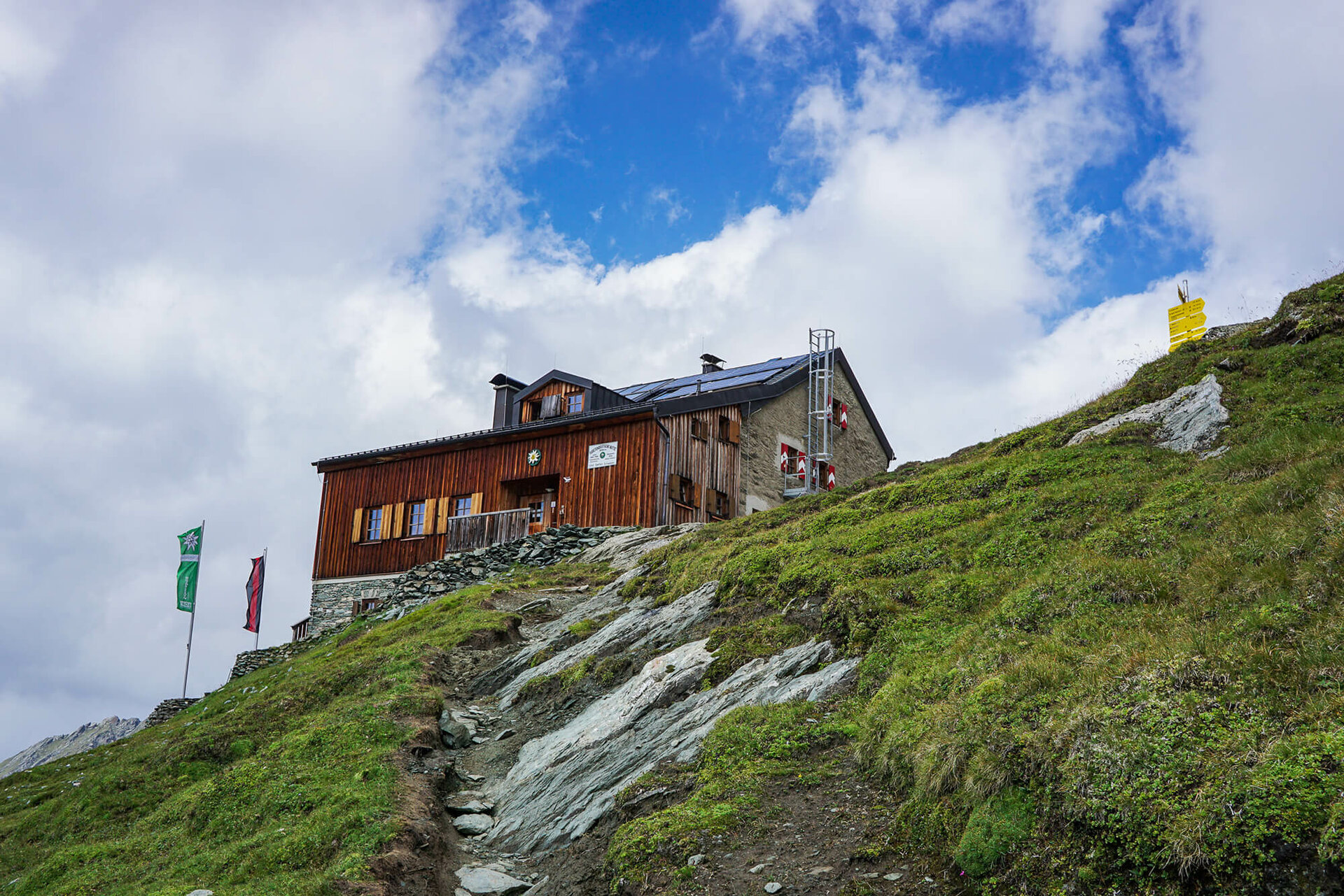 Von der Eisseehütte steigt man ein kurzes Stück zu den Wegtafeln des Venediger Höhenwegs hinab, wo dieser in den linken östlichen Hangbereich des Timmeltals lenkt.