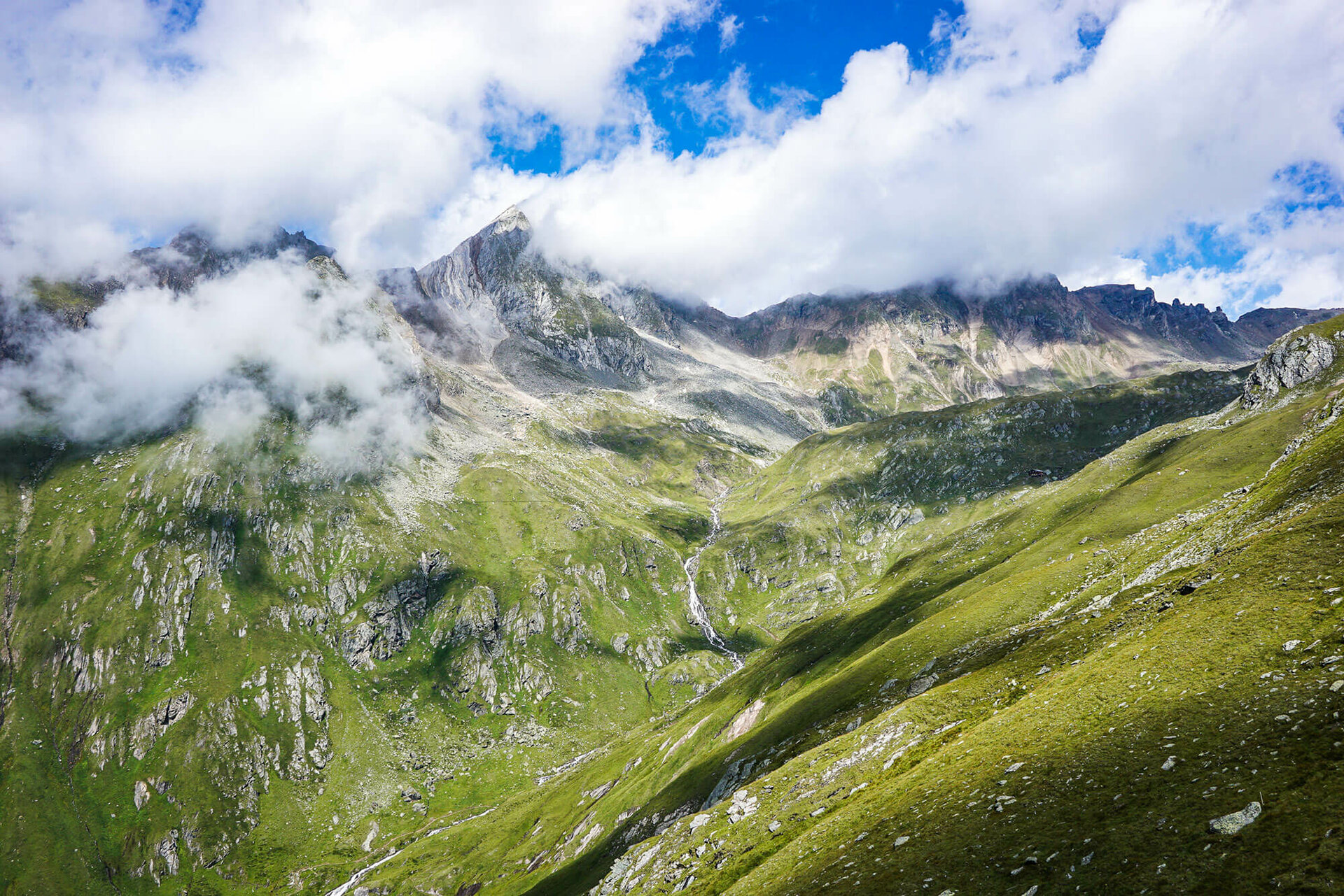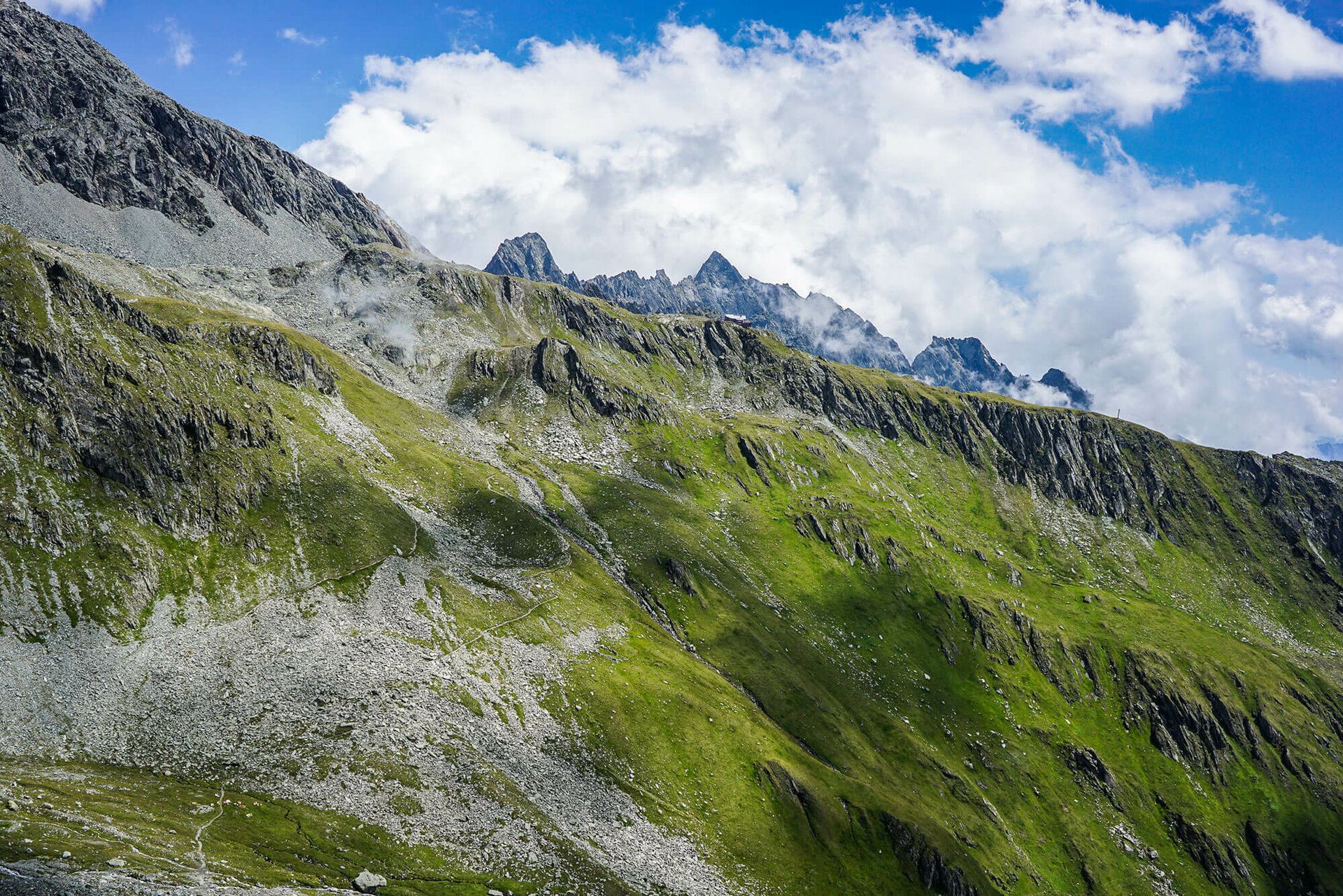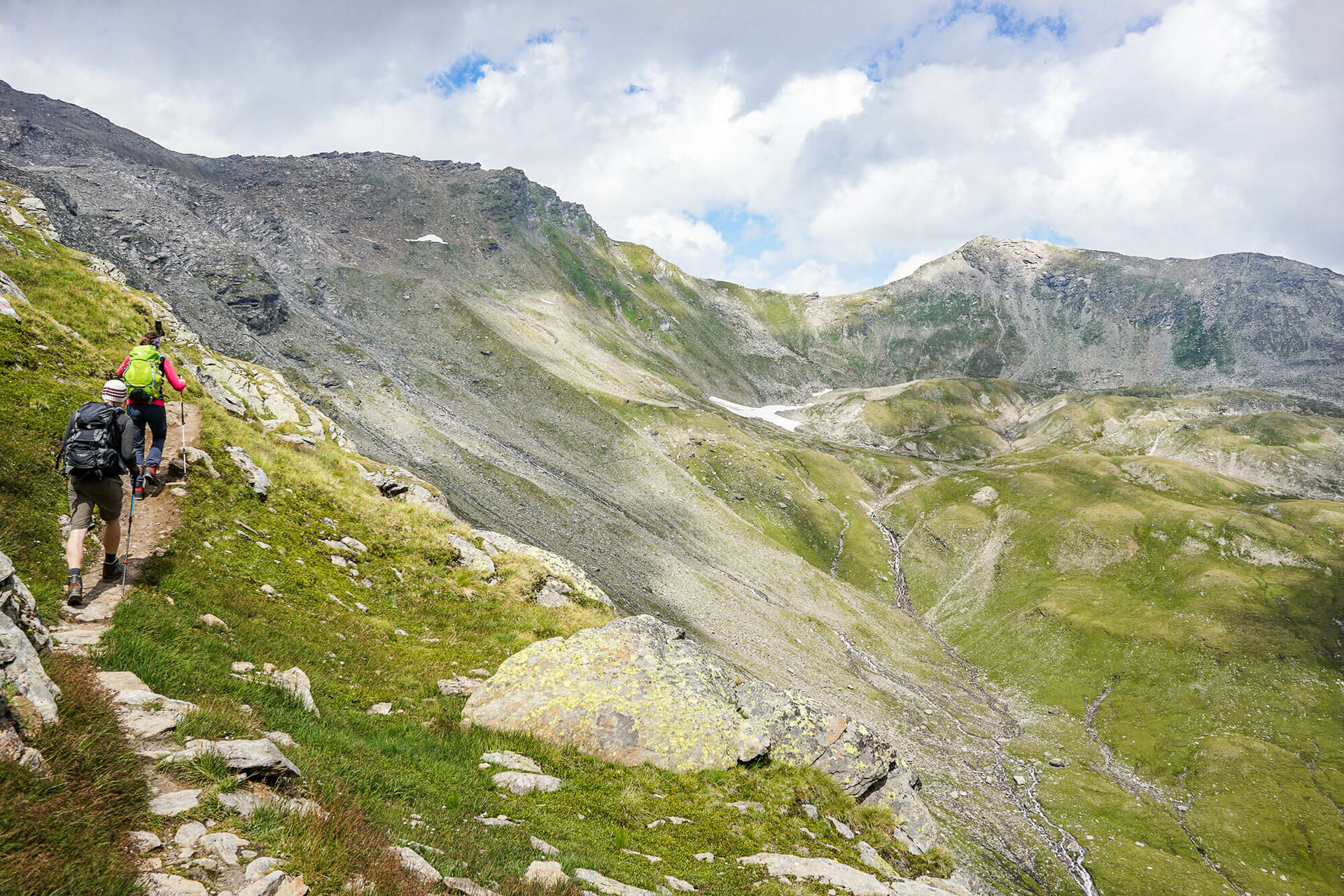 Weiter durch die faszinierende Bergwelt: Von der Johannishütte geht es Richtung Kreuzspitz-Höhenweg, anfangs durch satte grüne Matten, später durch felsiges Gelände.