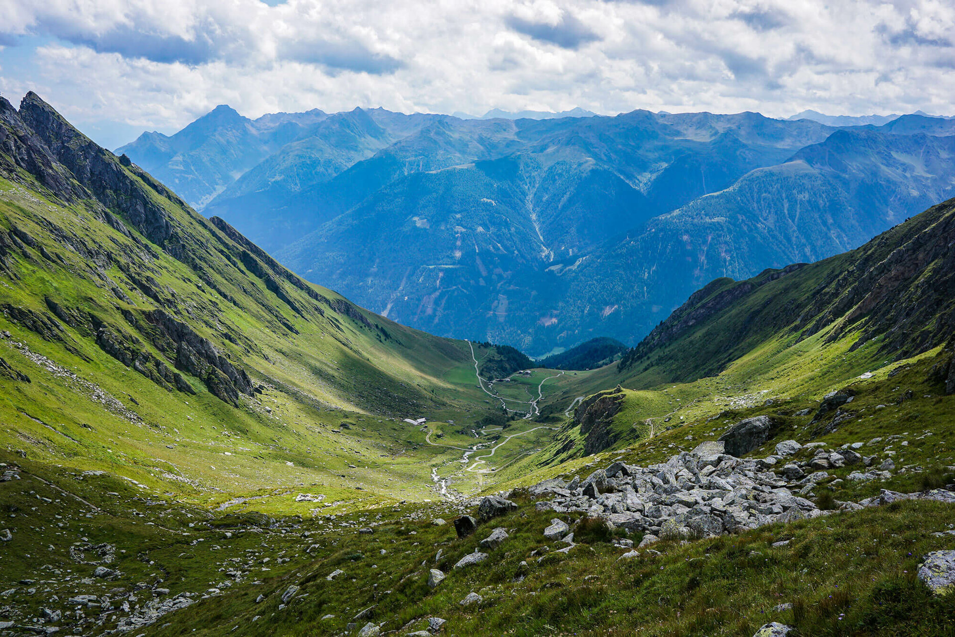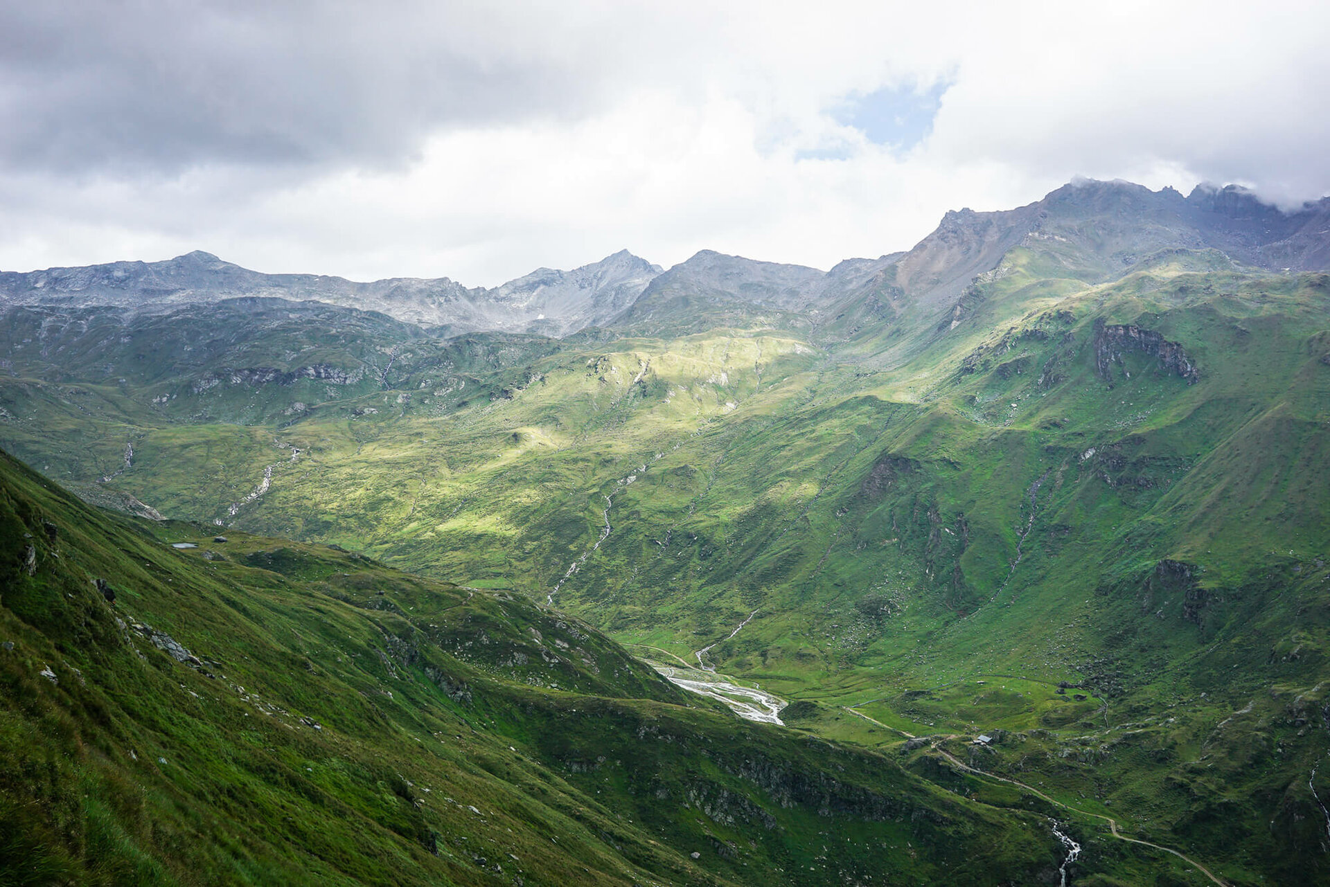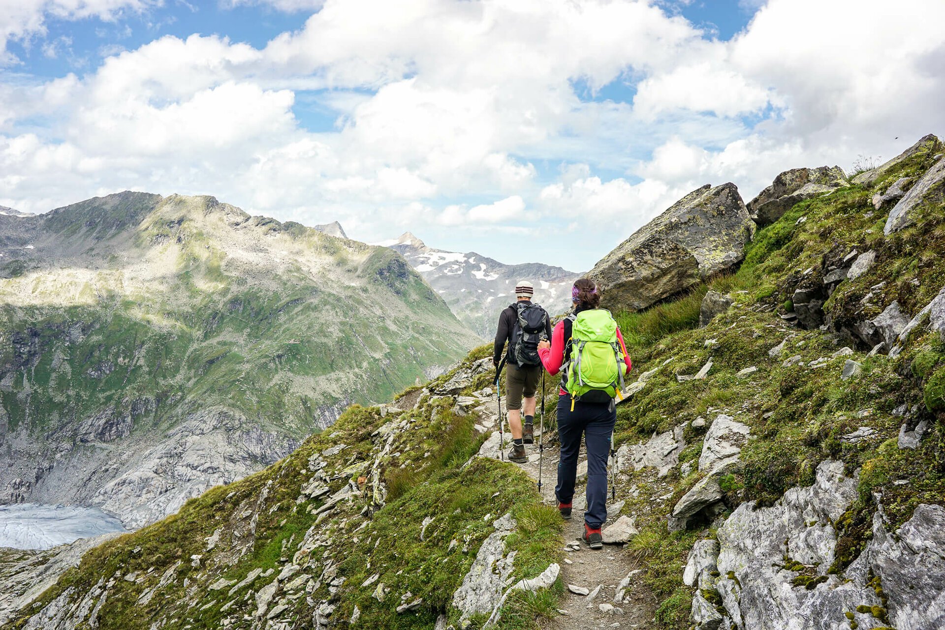 Weiter durch die faszinierende Bergwelt: Von der Johannishütte geht es Richtung Kreuzspitz-Höhenweg, anfangs durch satte grüne Matten, später durch felsiges Gelände.