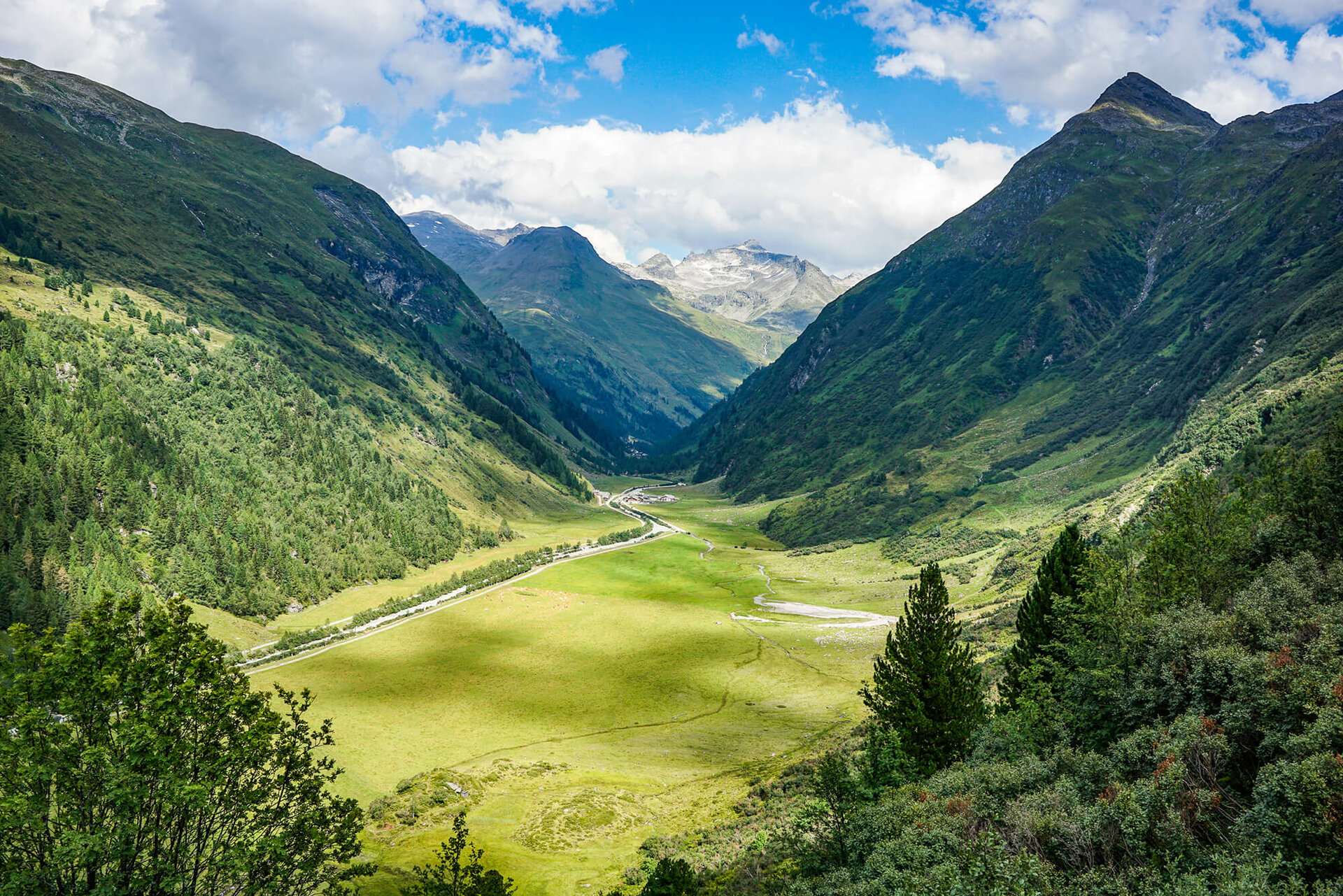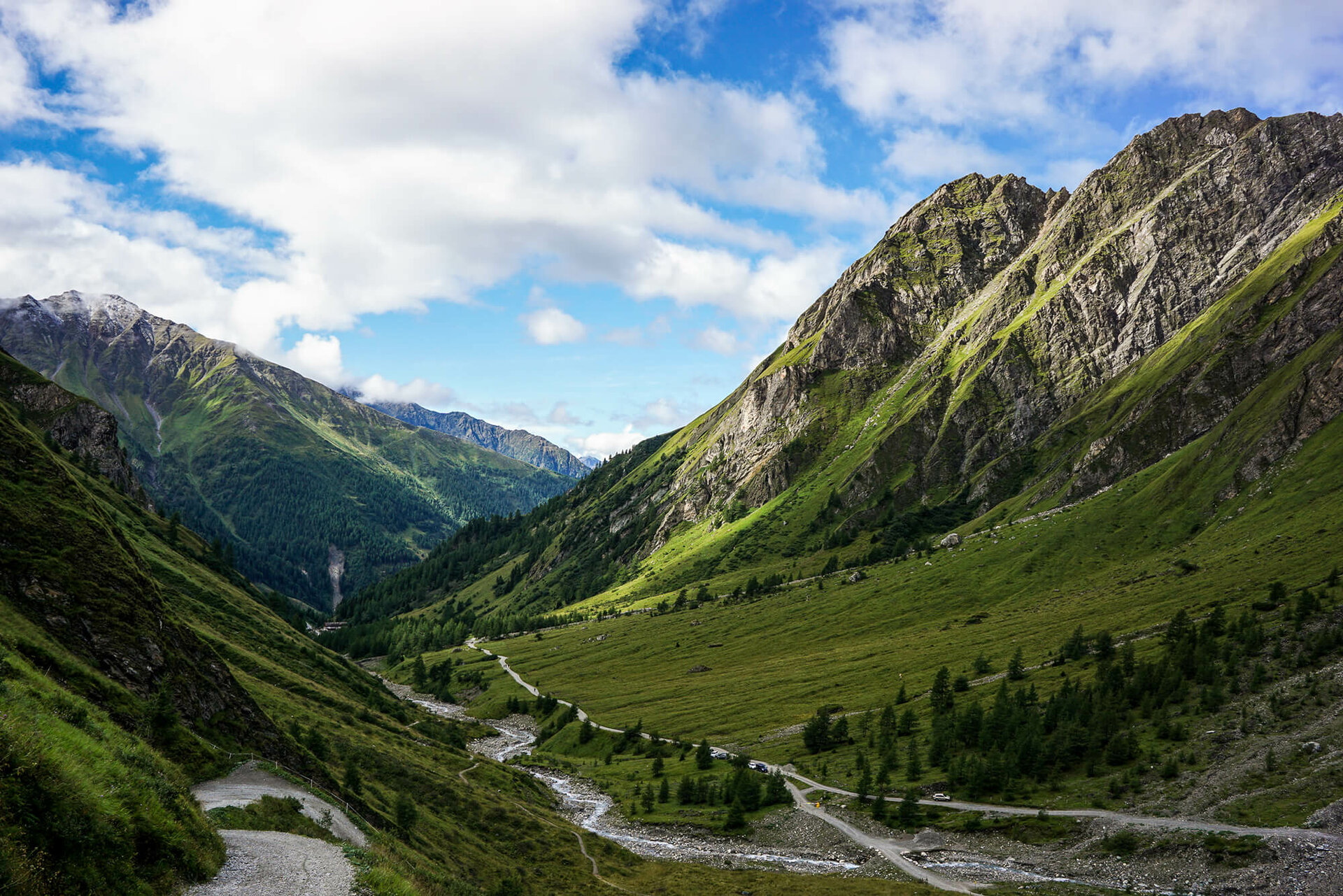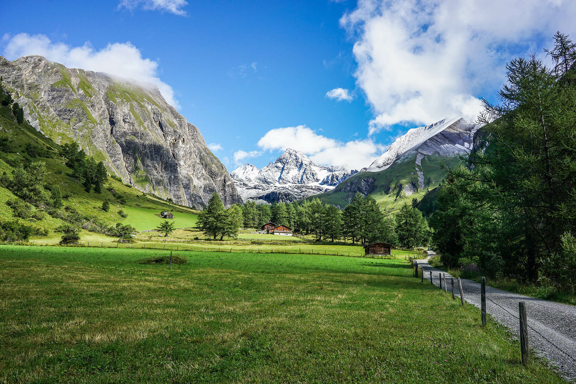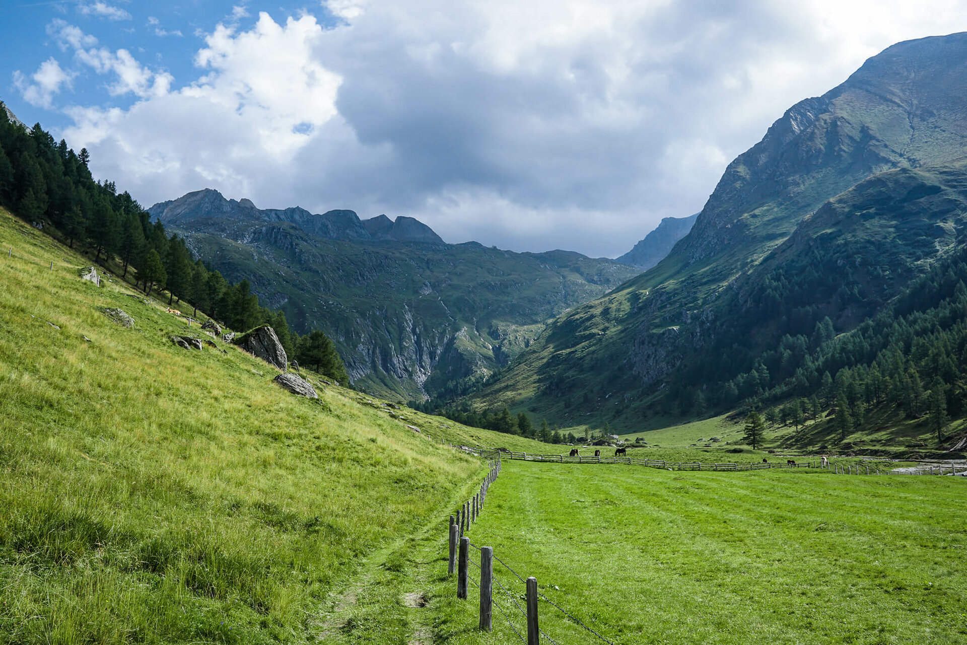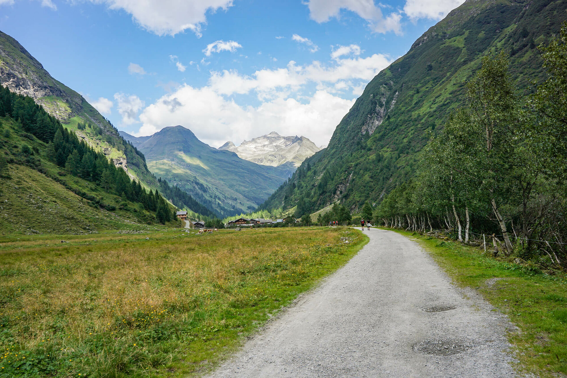Vom Kalser Tauernhaus verläuft der Adlerweg bis zur Moaalm ständig in Richtung Süden durch das liebliche Dorfertal auf einem breiten Almweg leicht abwärts.
