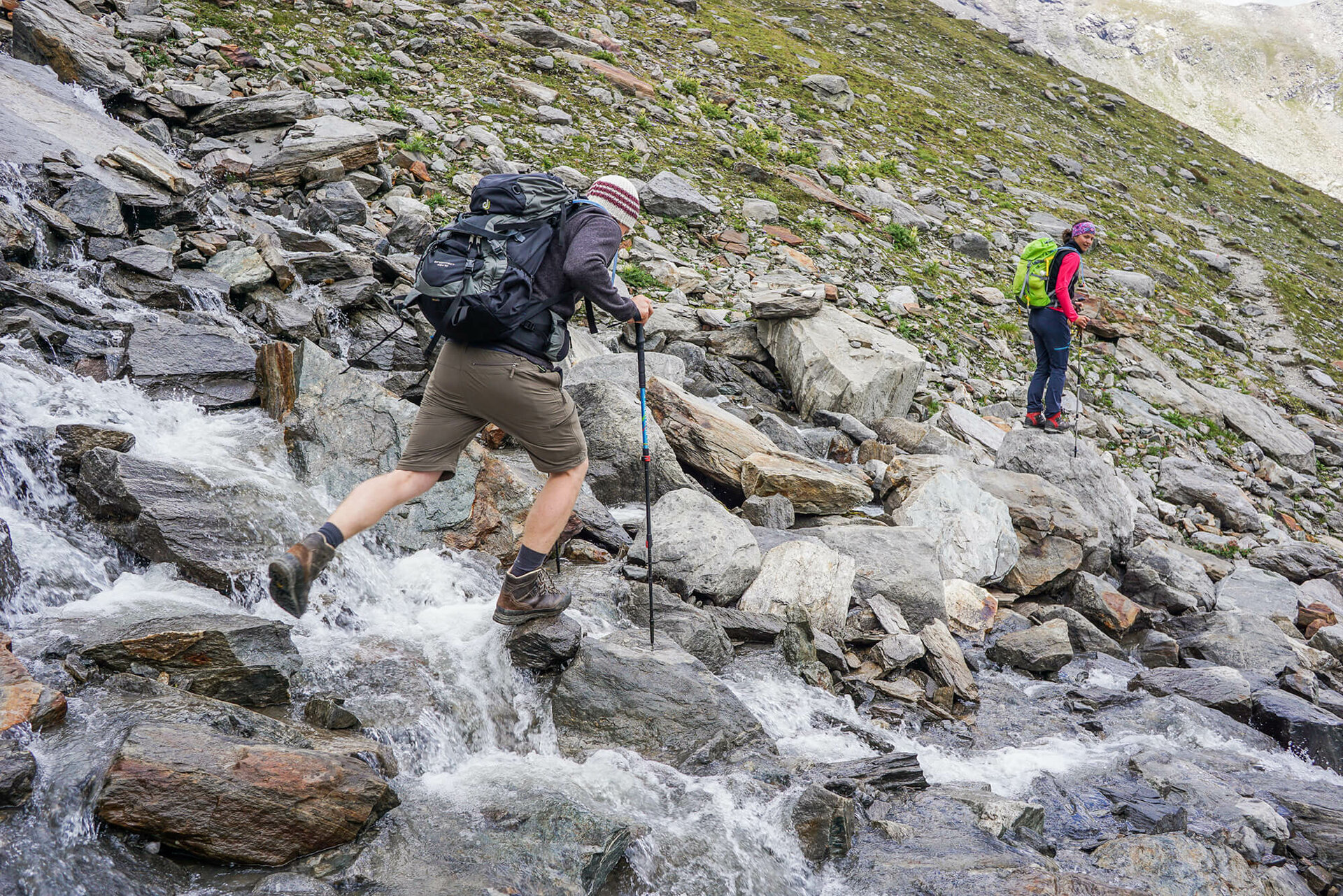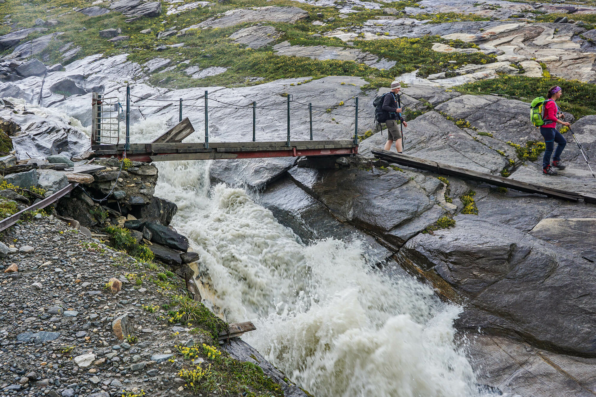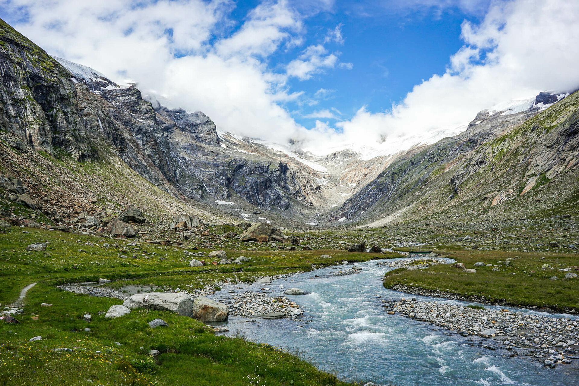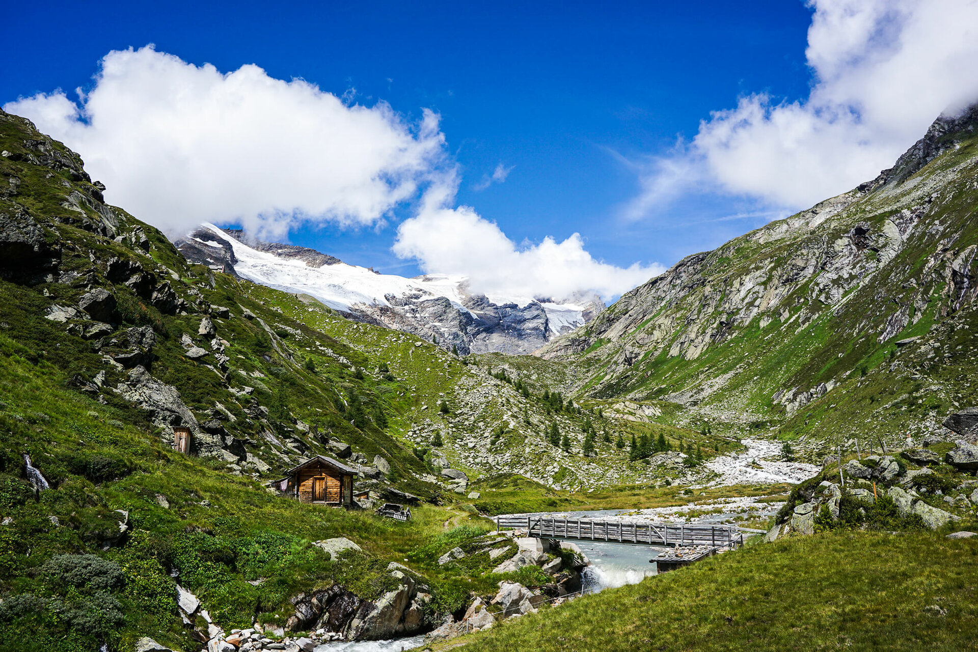Weiter führt der Steig, noch immer in Bachnähe, über drei sanfte Steigungen ins Vorfeld der gletscherbedeckten Venedigerberge und zur Brücke bei der oberen Ochsnerhütte am Maurerbach. Der kraftvolle Gletscherbach trennt die Göriacher von der westlich gelegenen Maurer Alpe.