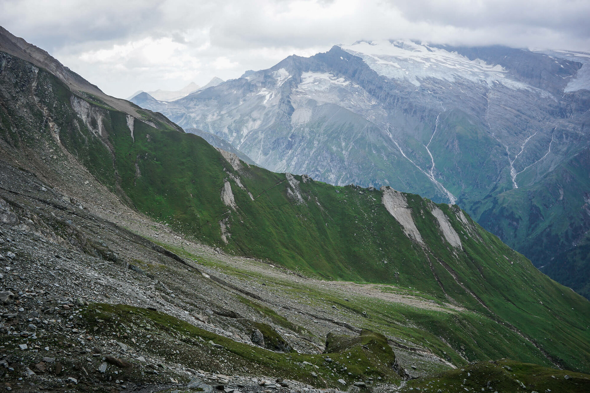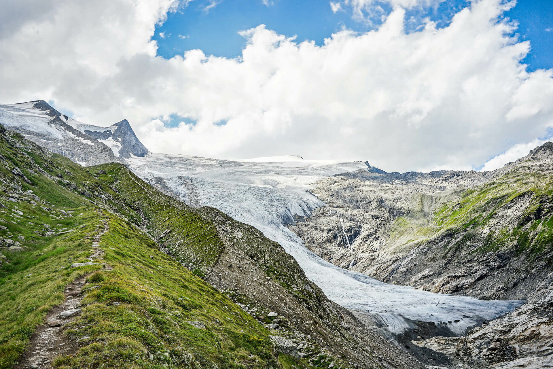 Dieser verläuft direkt unterhalb der Moränenfelder des Ködnitzkees´und mündet weit oberhalb der sogenannten Viehböden in den Johann-Stüdl-Weg (AV 702 B). Der zunächst gut ausgebaute Weg zieht nun hinauf durch Wiesenhänge, später wieder seilversichert nach oben. Jetzt hinein in das Schuttkar und darin weiter durch das Kar aufwärts.