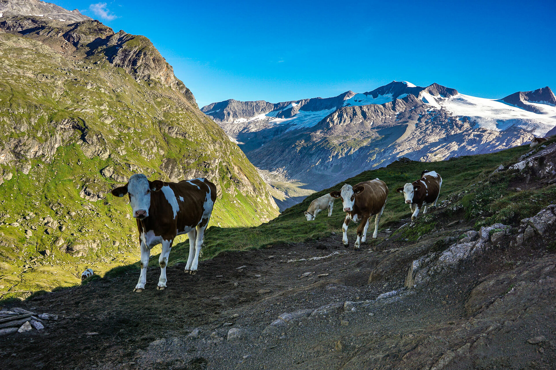 Der Weg führt jedoch vom Kalser Tauernhaus über sanfte Böden durch das liebliche Tal der Dorferalmen: Schönebenalm, Bergeralm, Moaebenalm und Moaalm sind geprägt durch idyllische Landschaft und intakte Landwirtschaft, urige Hütten offerieren gemütliche Einkehrmöglichkeiten.