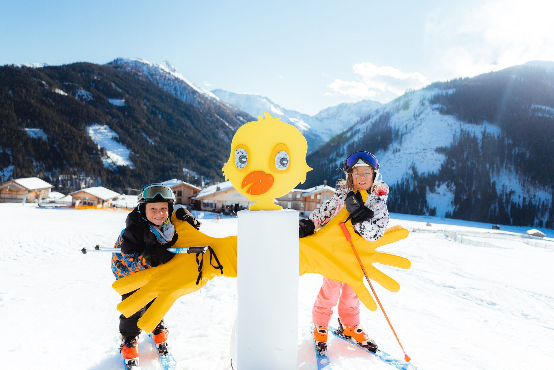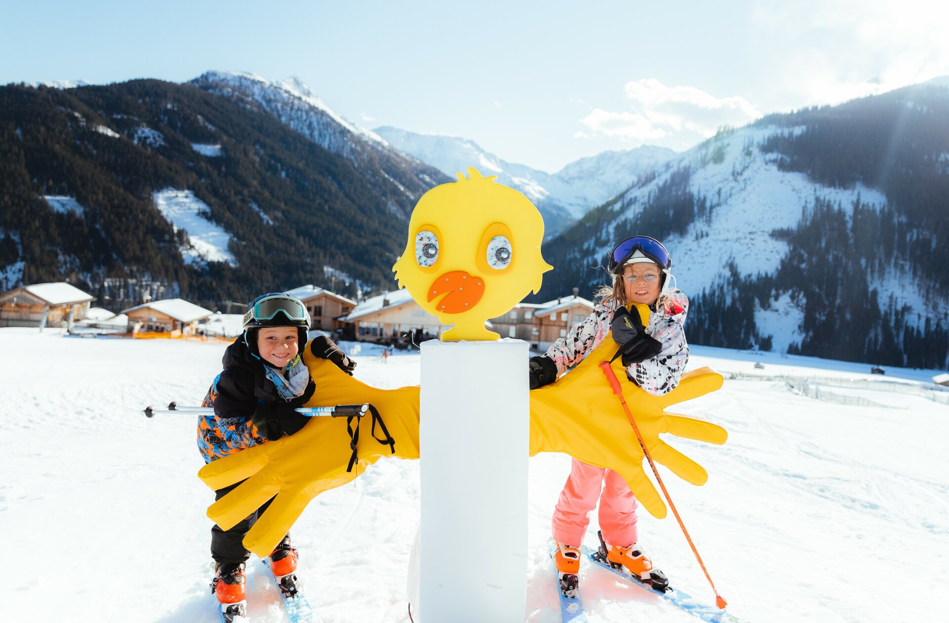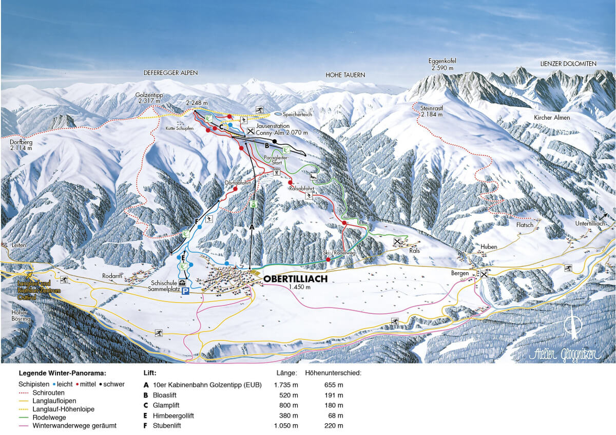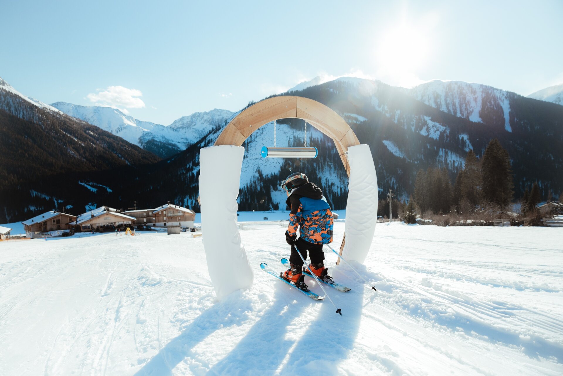 Direkt beim Himbeergoll-Lift erwartet unsere jüngsten Gäste ein wahres Schneeabenteuer: das Kinderland Obertilliach! Ein großer Zugangsbogen zeigt schon von Weitem den Eingang zum liebevoll gestalteten Kinderabenteuerplatz. Dort warten zahlreiche Highlights auf junge Skifans: Eine sanft geschwungene Wellenbahn hilft spielerisch beim Erlernen der Balance, eine Reihe kleiner Schanzen sorgt für erste aufregende Sprünge, und entlang der Strecke zeigen farbenfrohe Figuren den Weg.