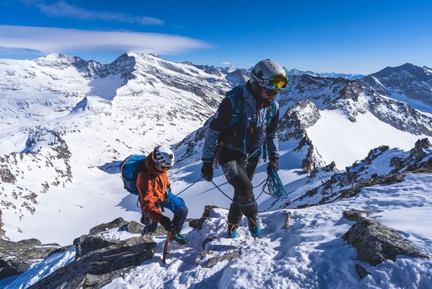 Vom Skidepot in komibiniertem Blockgelände (Steigeisen) in leichter Kletterei (max. II) hinauf zum Gipfel (3.086m).
