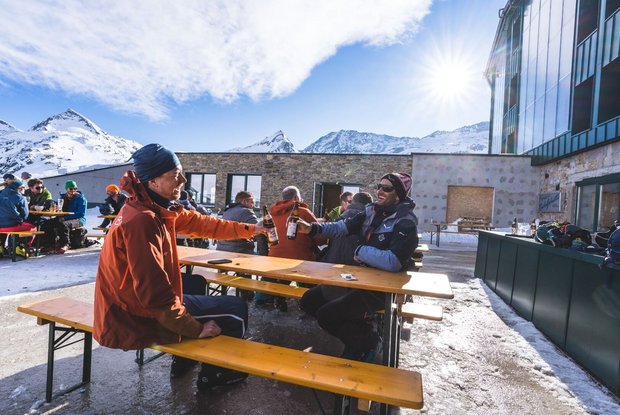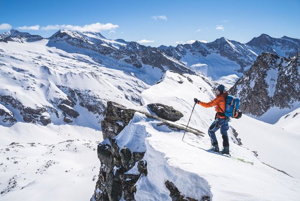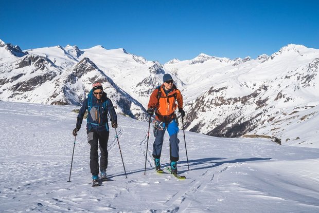 Vom Gipfel der Granatspitze lässt sich der weitere Routenverlauf gut einsehen. Zurück zum Skidepot und anschließend im oft viel befahrenen Gelände hinunter in Richtung Weißsee. Je nach Verhältnissen früher oder später nach links orientieren, beide Varianten sind möglich. Lediglich in der Mitte des Hangs ist ein markanter Felsriegel, der von oben schwer einsehbar ist. Kurz vor dem Weißsee nach rechts in langer Schrägfahrt oberhalb des Seeufers in Richtung der Talstation des Medelzlifts halten. Die letzten Meter auf der Piste hinauf zur Rudolfshütte (2.311m), alternativ auch mit dem Schlepplift vor der Hütte.