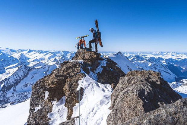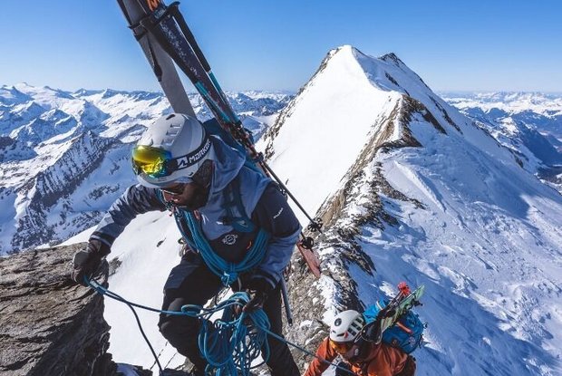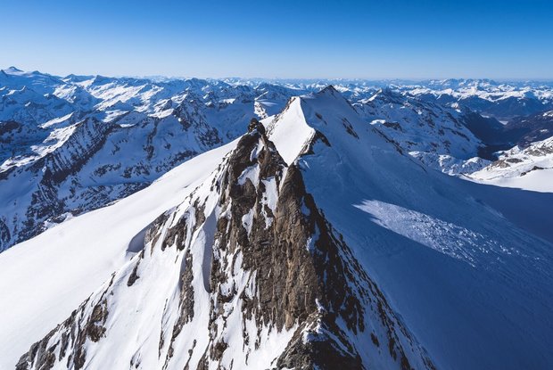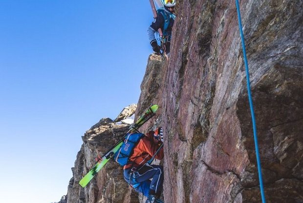 Dann Anfellen und entweder von links über eine Rampe unter einem Gletscherbruch hindurch oder bei guter Schneelage direkt in Spitzkehren hinauf bis auf die Schneewinkelscharte (3.412m). Hier werden die Ski aufgebunden und mit Steigeisen geht es auf dem Grat in Richtung Romariswandköpfe (3.511m) weiter. Zunächst in kombiniertem Kletter-/Gehgelände hinauf in Richtung des ersten Romariswandkopfes. Zuletzt in schwierigerer Kletterei (bis III. Grad UIAA, eine Stelle III+) auf den sehr ausgesetzten Romariswandkopf. Einige Möglichkeiten zur Sicherung sind vorhanden (Stangen). Der Übergang zum zweiten Romariswandkopf kann am laufenden Seil zurückgelegt werden (ebenfalls Stangen). Der letzte Aufschwung zum zweiten Romariswandkopf ist noch mal exponierte, aber recht ansprechende Kletterei – der Fels ist wenig brüchig.