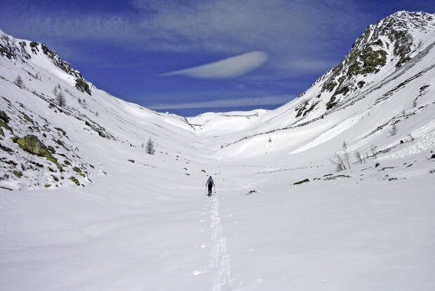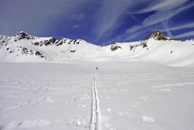 Ausgangspunkt ist der Weiler Tögisch (1.653 m), welcher über eine schmale, steile Bergstraße, die in St. Jakob kurz vor dem Eingang ins Trojer Almental ansetzt, zu erreichen ist. Wenige Parkmöglichkeiten beim Bauernhof. Bei Schneefahrbahn heißt es bald mal Ketten montieren, gerade dann, wenn die Winterreifen nicht mehr die neuesten sind. Nach wenigen Metern leiten uns gelbe Wegtafeln, den langen Forstweg abkürzend, in den Bannwald, den wir aber bald wieder verlassen, um auf der zuvor erwähnten Straße ins Tögischer Tal zu streben. Nach einem felsigen Eck folgt eine kurze Abfahrt mit den Fellen in die Talsohle und wir beginnen mit dem Anstieg durch das herrliche Hochtal. Immer Richtung Norden gelangen wir bei ca. 2.300 m und 2.400 m zu einem breiten, sperrenden Riegel, welcher ostseitig in der etwas weniger steilen Flanke umgangen wird. Achtung: Dieser Abschnitt ist oft mit trügerischem Triebschnee gefüllt und erfordert dementsprechend Vorsicht. Nach dem Aufschwung wird das Gelände wieder flacher und die Skispur schwingt sich in der Talmitte durch Böden und Mulden bergwärts. Auf ca. 2.580 m treffen wir auf einen Wegweiser, der nach Westen zu den tiefverschneiten Knappengruben zeigt. Wir halten uns jedoch im rechten Talbereich und steigen in den letzten Boden unterhalb des breiten Prägratner Törls, das eigentlich aus zwei Einschartungen besteht. Für uns ausschlaggebend ist allerdings die rechte, links des markanten Felshorns. In wenigen Spitzkehren geht es über einen kurzen Hang in die geräumige Scharte (4 Stunden von Tögisch). Abfahrt entlang der Aufstiegsspur.