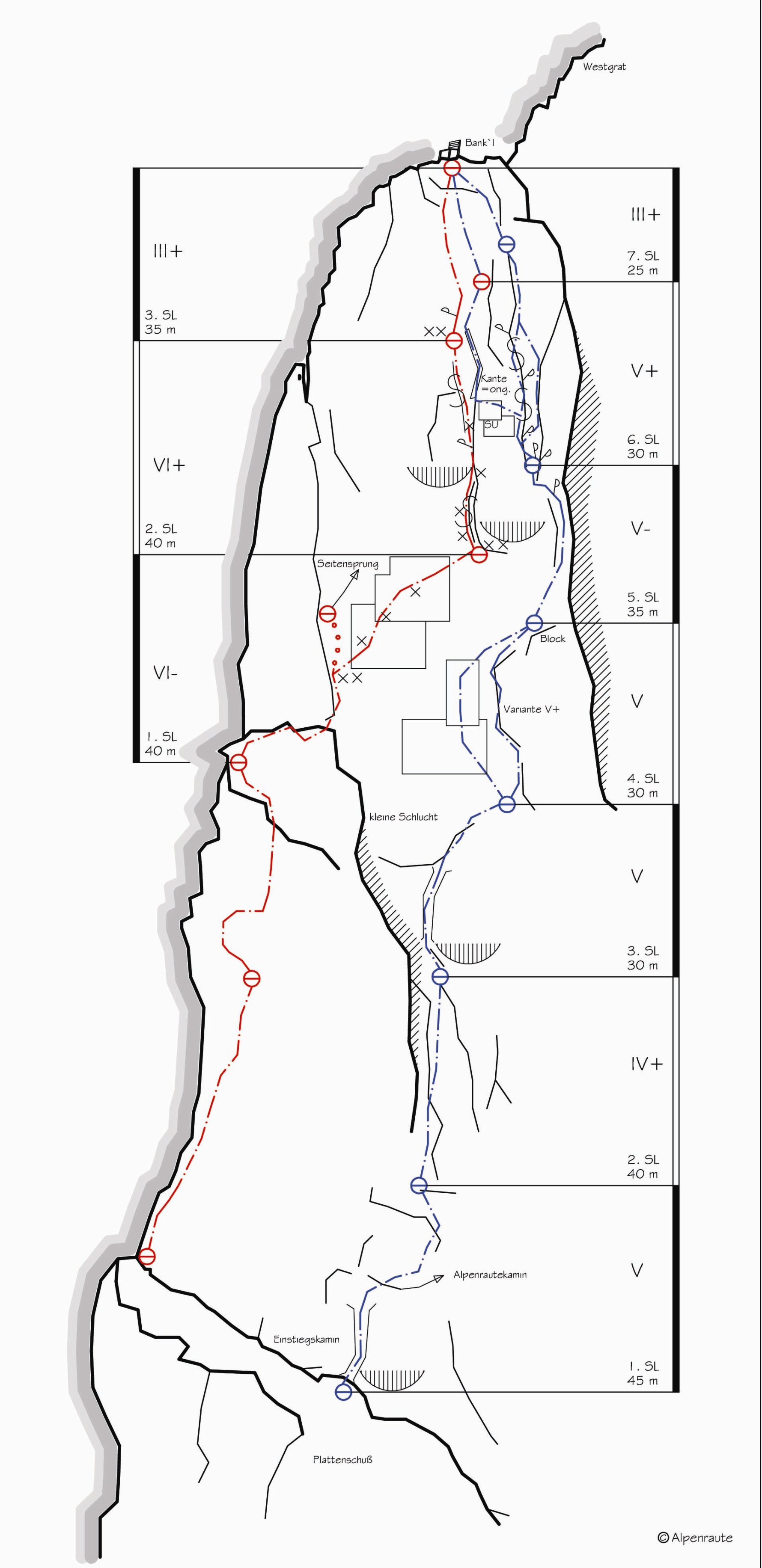 Einstieg in der 3. SL der Westkante, rechts über Platte ansteigend.