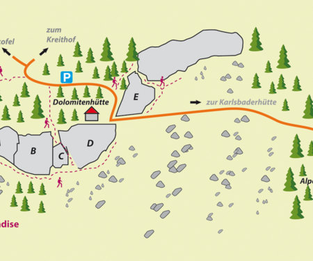 A circa 1.600 metri di altitudine, appena accanto a una scogliera, si aggrappa al monte la Dolomitenhütte, nel cuore delle Dolomiti di Lienz. Direttamente sotto il rifugio, 116 vie di arrampicata attraversano le pareti rocciose che scendono ripidamente a sud. Gli arrampicatori non dovrebbero farsi troppo distrarre dalla vista delle imponenti cime dolomitiche se vogliono completare la via "Another Play in Paradise" – almeno fino al primo punto di sosta. Nella parte superiore, con il tipico calcare alpino, si trovano passaggi tecnici impegnativi, ben protetti da ancoraggi a sonda.
