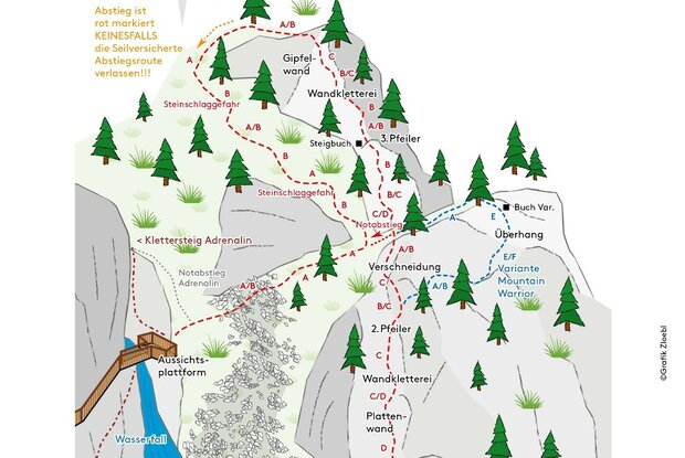 Particolarità: La “via normale” convince per il tracciato aerei. Particolare è la variante “Mountain Warrior” - via ferrata assolutamente difficile (E/F) con imponente strapiombo - e solo per avambracci davvero forti!
