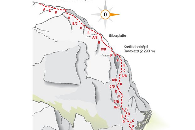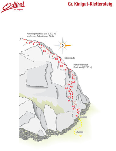 La nuova via ferrata possiede un carattere fortemente alpino e presenta i livelli di difficoltà AD. Passando per la valle Erschbaumertal fino al parcheggio (tempo di percorrenza 1 ½ - 2 h), un'altra ora di salita conduce all'accesso della via ferrata (2.100 m). Passando per un’area di arrampicata con placche si arriva alla piazzola Kartitscherköpfl (2.290 m) poi si attraversa il Silberplatte (2.350 m) fino alla salita Hochkar (2.550 m). Con questa si è superata la lunghezza della parete di arrampicata di 650 m con 450 m di dislivello. Il tempo necessario è indicato in 2 ½ h. Dall'uscita alla vetta della Gr. Kinigat (2.689 m) sono necessari circa 45 min. La via ferrata della categoria "molto difficile" non offre possibilità di discesa di emergenza. Si consiglia espressamente di portare l'attrezzatura completa da arrampicata (casco, scarpe da arrampicata e fune).