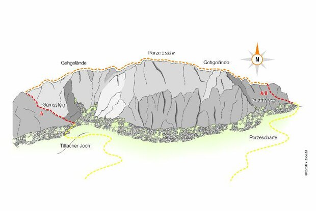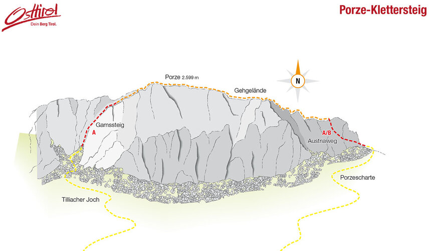 Punto di partenza per questa escursione di arrampicata è il lago Klapfsee (1.942 m), raggiungibile di sabato e domenica anche con l'auto. Per tutto l'itinerario di salita sono necessarie circa 2 ore - 2 ore e mezza. Dal Tilliacher Joch si segue la vecchia strada militare sul versante italiano fino al primo tornante e poi lo si lascia. Si prosegue seguendo il sentiero segnalato fino a raggiungere un sentiero ciottolato breve ma piuttosto ripido. Da qui si attraversa una via ferrata protetta con funi di acciaio il versante SE del Porze, e si raggiunge la cresta. Ricoperto d’erba e flora meravigliosa si presenta il versante meridionale del Porze. A zig zag si segue la vecchia carrareccia del tempo di guerra, passando per rifugi diroccati. Nell'ultimo tratto che porta alla vetta la strada diventa di nuovo più stretto e roccioso.