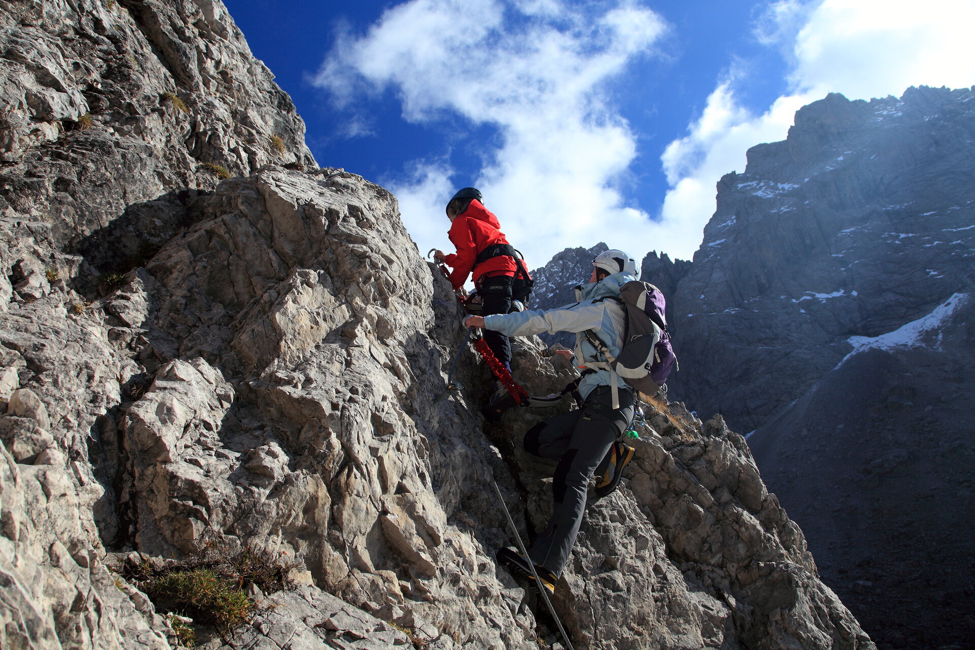 An den Laserz-Wänden sind über kurze Zustiege auch leichtere Touren erreichbar, so etwa die Egerländer Kante