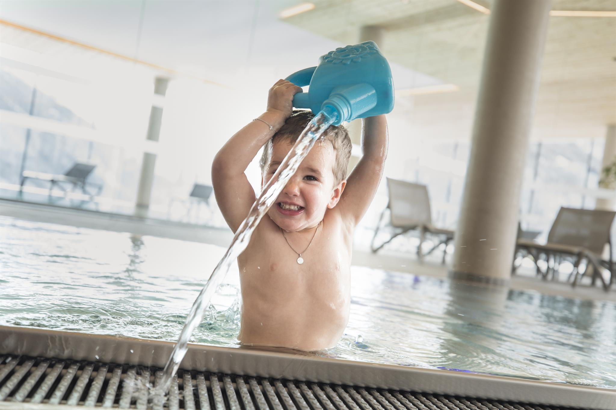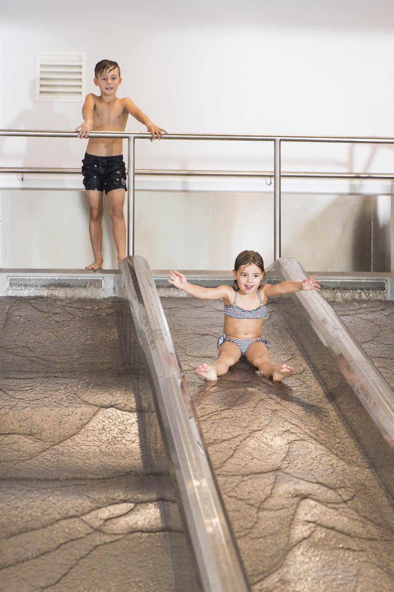 Unsere neue Wasserwelt verfügt über ein großes Becken mit 12 Meter Länge und getrenntem Kinderbereich mit Kleinkinderbecken und Triple Slide-Wasserrutsche.