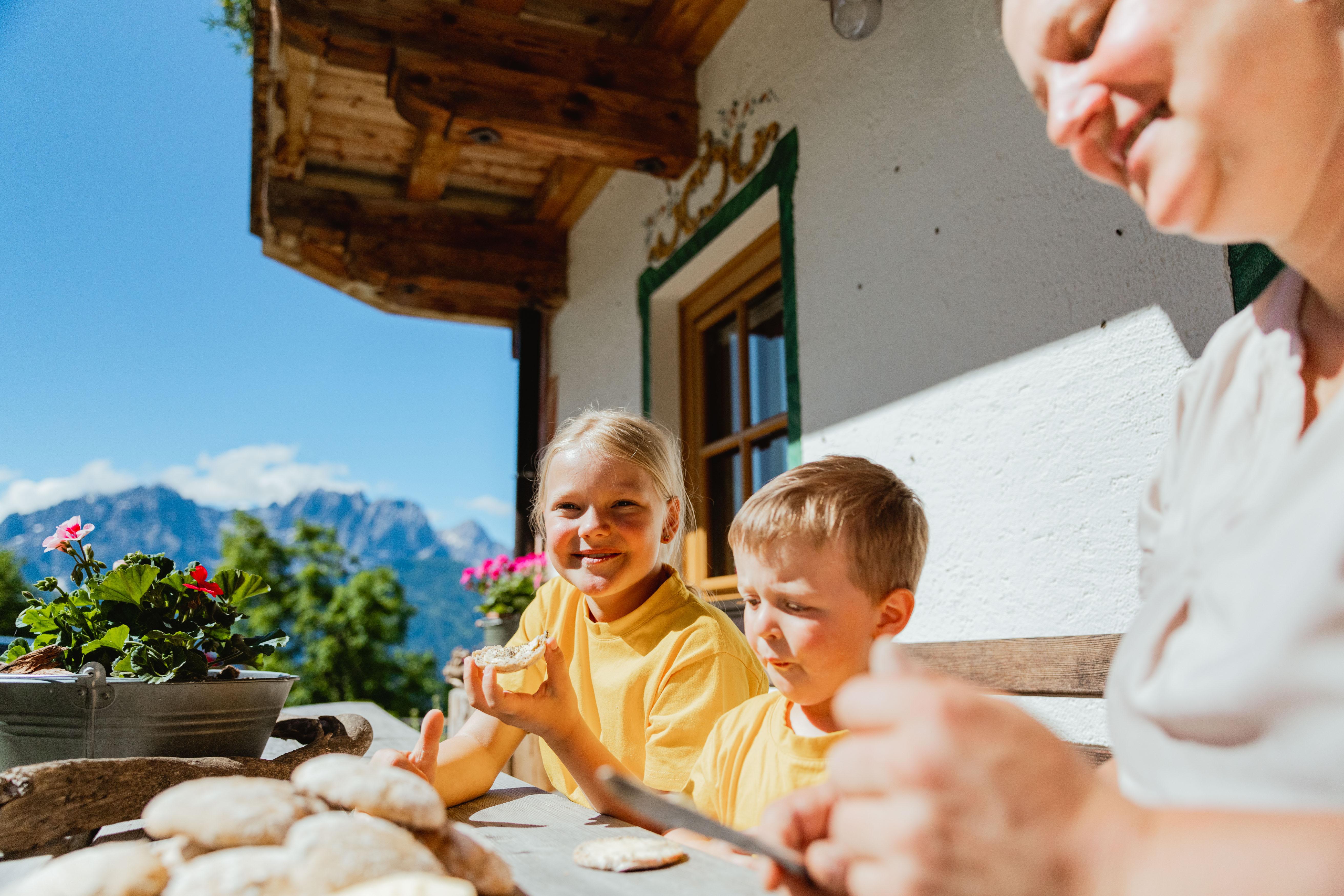 Freier Blick auf das Berg-Panorama der Lienzer Dolomiten und die Sonnenstadt Lienz. Ruhige und sonnige Lage abseits jeglicher Hektik. Frühstückskörberl mit Hofprodukten. Schau Bäuerin Margit und Bauer Leo bei der Stall- und Hofarbeit über die Schulter.